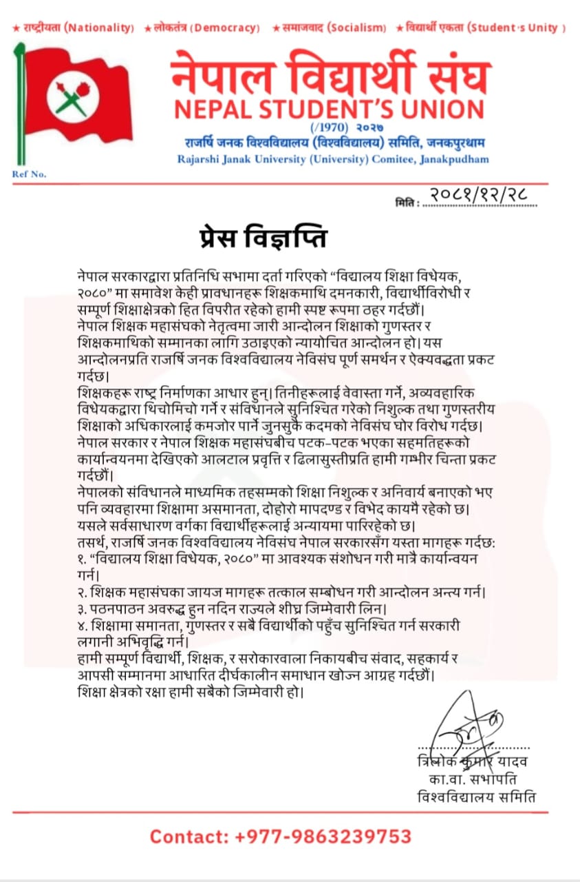 राजर्षि जनक विश्वविद्यालय नेविसंघले चारवटा मागहरू राख्दै नेपाल सरकारसँग तत्काल सम्बोधन गर्न आग्रह गरेको छ । विद्यालय शिक्षा विधेयक, २०८० मा आवश्यक संशोधन गरेर मात्र कार्यान्वयन गर्न, शिक्षक महासंघका जायज मागहरू अविलम्ब सम्बोधन गरी आन्दोलन अन्त्य गर्न पहल गर्न, पठनपाठन नरोकिने वातावरण निर्माण गर्न सरकार तुरुन्त सक्रिय हुने र शिक्षामा समानता र गुणस्तरको सुनिश्चितताका लागि सरकारी लगानी अभिवृद्धि गर्न माग गरिएको हो ।