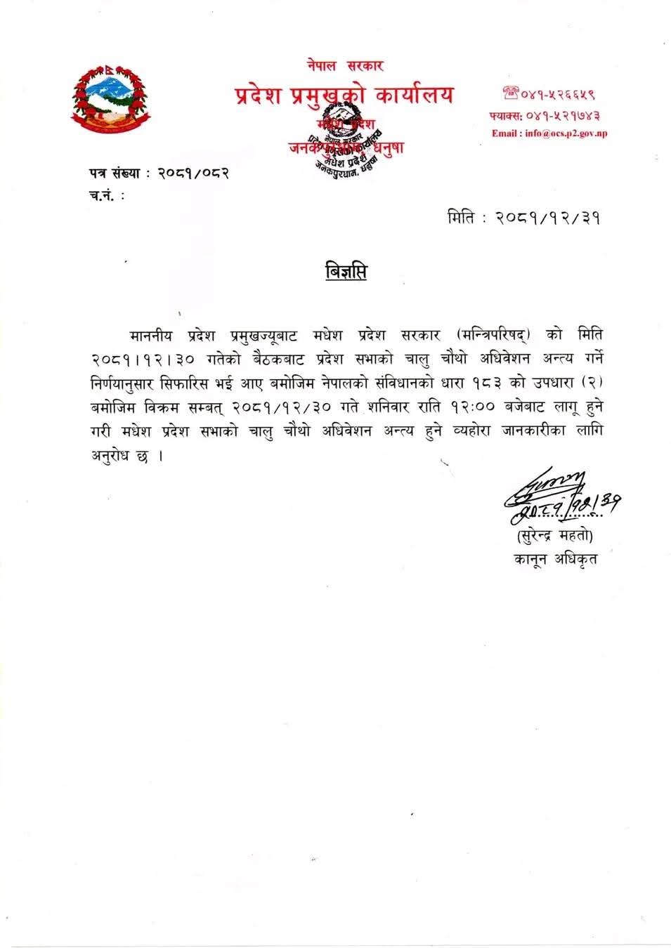 जनकपुरधाम, ३१ चैत । मधेश प्रदेश सभाको चौथो अधिवेशन चैत ३० गते राति १२ बजेबाट औपचारिक रुपमा अन्त्य भएको छ । संविधानको धारा १८३ को उपधारा (२) अनुसार प्रदेश प्रमुख सुमित्रा सुवेदी भण्डारीले मन्त्रिपरिषद्को सिफारिसमा अधिवेशन अन्त्यको घोषणा गरेकी हुन् ।