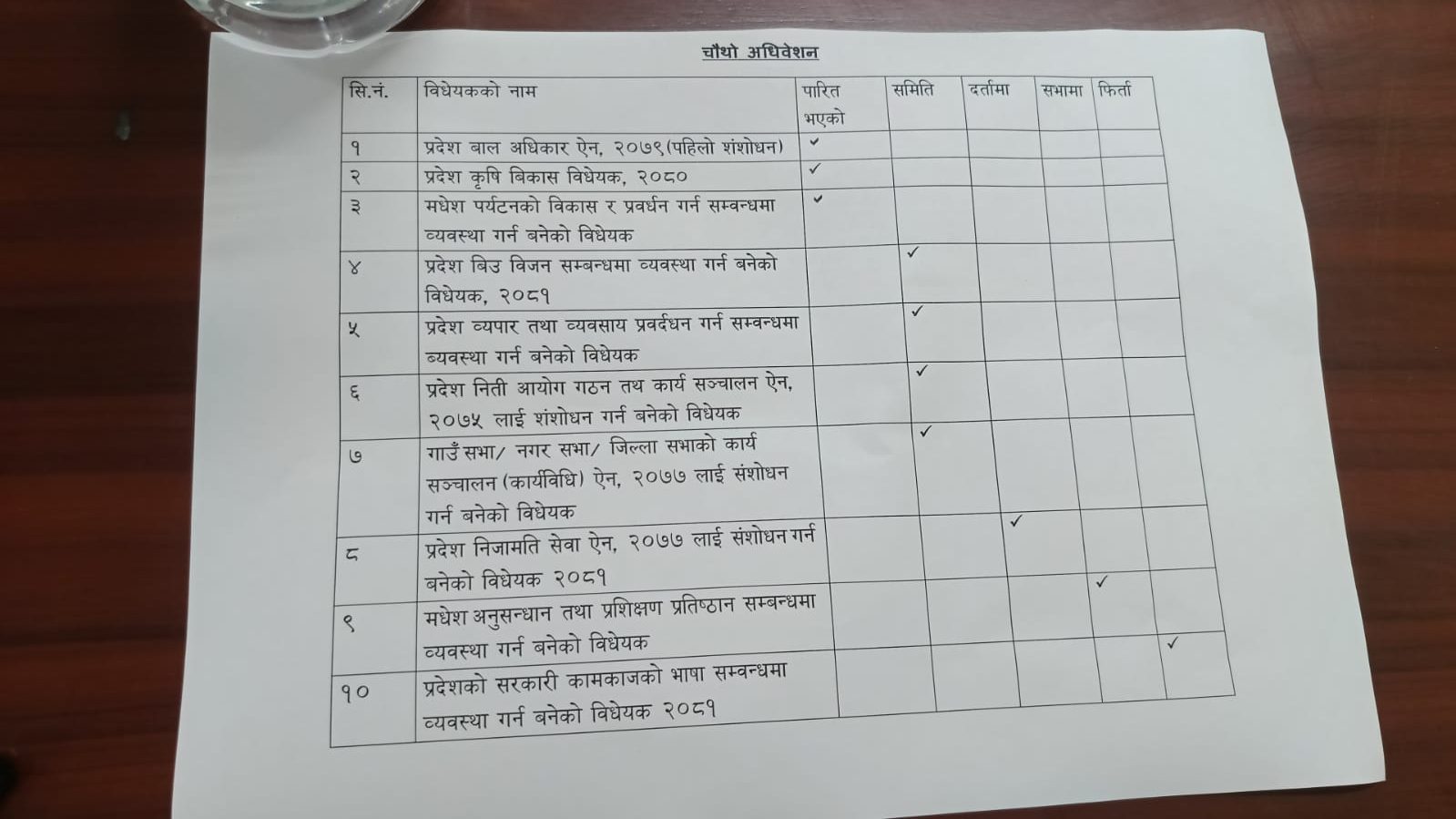 मधेश प्रदेश सभाको चौथो अधिवेशन सम्पन्न, १० विधेयकमध्ये ३ पारित