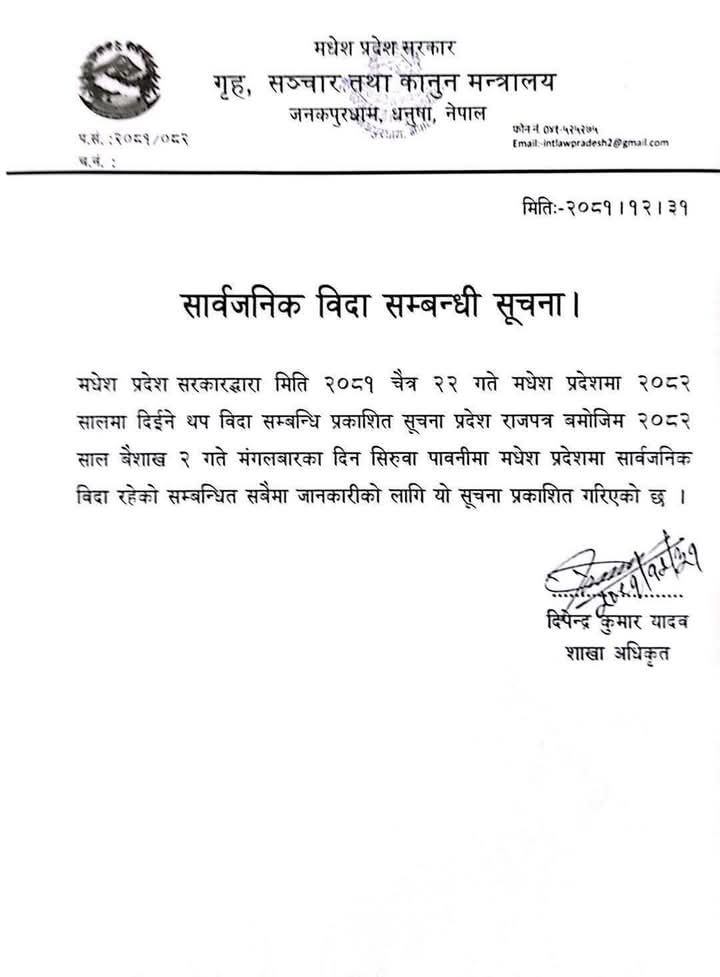 मधेशमा मंगलबार सार्वजनिक विदा
