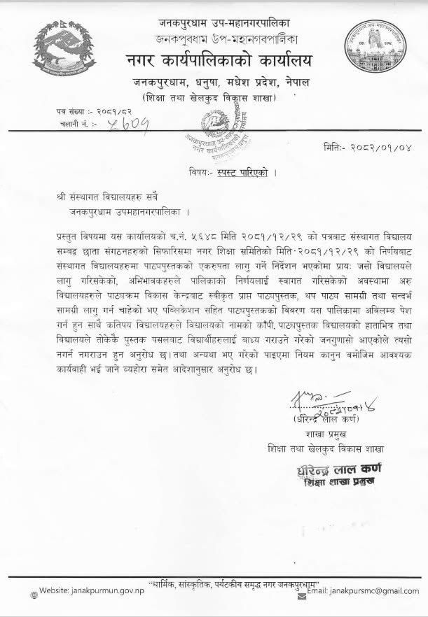 जनकपुरधाम, ४ वैशाख । जनकपुरधाम उपमहानगरपालिकाले नगरभित्र सञ्चालित सबै संस्थागत विद्यालयमा पाठ्यपुस्तकको एकरुपता अनिवार्य रूपमा लागू गर्ने निर्णय गरेको छ । नगर शिक्षा समितिको चैत २९ गते बसेको बैठकको निर्णयअनुसार अब सबै विद्यालयले पाठ्यक्रम विकास केन्द्रबाट स्वीकृति प्राप्त पाठ्यपुस्तकमात्र प्रयोग गर्नुपर्नेछ ।