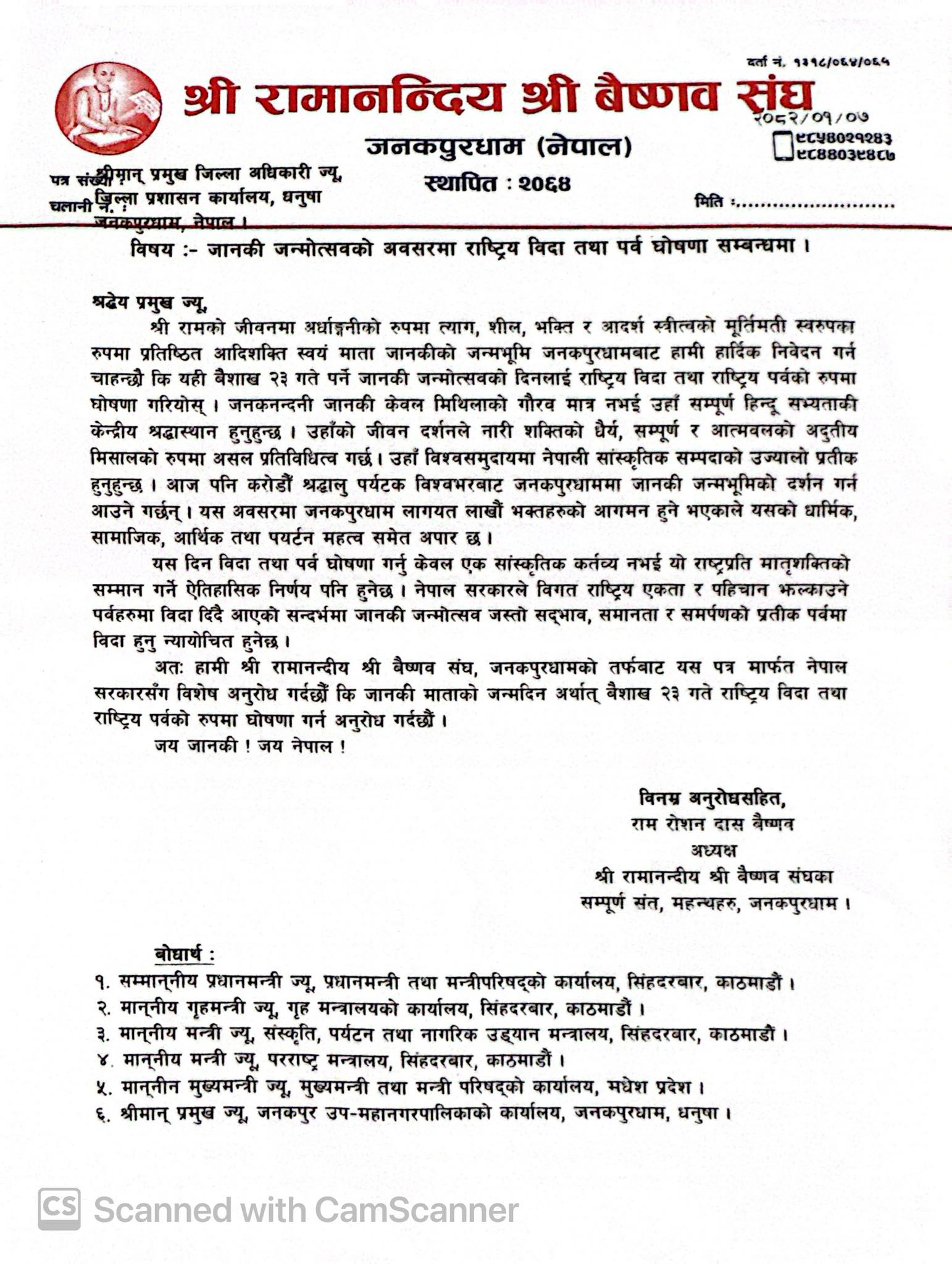 जनकपुरधाम, ७ वैशाख । आदिशक्ति जानकी माताको जन्मोत्सवको अवसरमा राष्ट्रिय विदा घोषणा गर्नुपर्ने मागसहित जनकपुरधामस्थित श्री रामानन्दीय श्री वैष्णव संघले धनुषाका प्रमुख जिल्ला अधिकारी रामुराज कडरीयालाई ज्ञापनपत्र बुझाएको छ ।