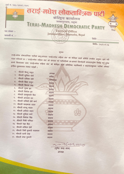 समितिका सदस्यहरूमा बिभा ठाकुर, बिमला साह, पूनम झा, निर्मला झा, रामकुमारी बिन, अञ्जना दत्त, रागिनी देवी कर्ण, चन्द्रकला राउत, मञ्जू यादव, अनिता महरा, सुनिता कर्ण, निर्मला सिंह, पिंकी पण्डित, रेखा बैठा, ललिता देवी, रिंकी कुमारी पासमान, रुन्टी साह र मेघा कुमारीलाई मनोनयन गरिएको हो ।