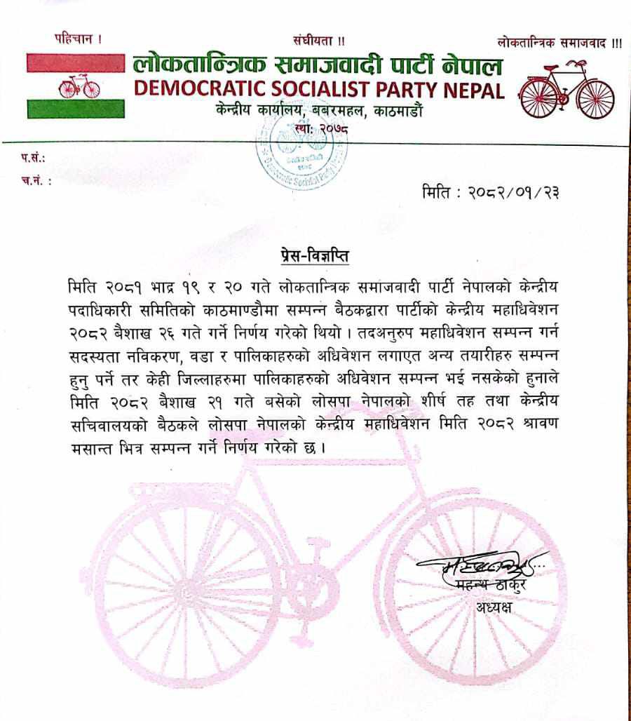 पार्टी अध्यक्ष महन्थ ठाकुरद्वारा जारी विज्ञप्ति अनुसार यसअघि २०८२ वैशाख २६ गते महाधिवेशन गर्ने निर्णय भए पनि केही जिल्लाहरूमा आवश्यक संरचनागत तयारी अपूरा भएकाले महाधिवेशनको मिति पुनः संशोधन गरी साउन मसान्तभित्र सम्पन्न गर्ने निर्णय गरिएको हो ।