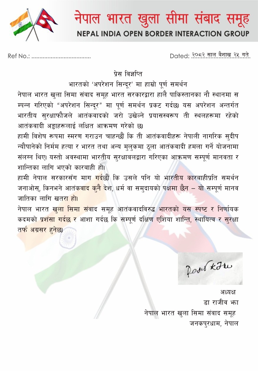 जनकपुरधाम, २४ वैैशाख । भारतद्वारा हालै पाकिस्तान शासित कश्मीरमा सञ्चालित ‘अपरेशन सिन्दूर’ मा नेपाल भारत खुला सिमा संवाद समूहले समर्थन जनाएको छ ।