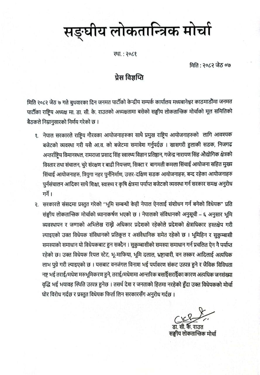 संघीय लोकतान्त्रिक मोर्चाले संसद्मा पेश भएको ‘भूमि सम्बन्धी केही नेपाल ऐनलाई संशोधन गर्न बनेको विधेयक’ प्रति गम्भीर आपत्ति जनाउँदै यसलाई संविधानको मर्म विपरीत र संघीयता विरोधी बताएको छ । संविधानको अनुसूची–६ अनुसार भूमि व्यवस्थापन, अभिलेख राख्ने अधिकार प्रदेशको क्षेत्राधिकारमा पर्दछ भन्ने उल्लेख गर्दै संघीय अधिकारमा हस्तक्षेप गरी ल्याइएको विधेयक असंवैधानिक, जनविरोधी र दलीय स्वार्थमा आधारित रहेको ठहर गरिएको छ ।
