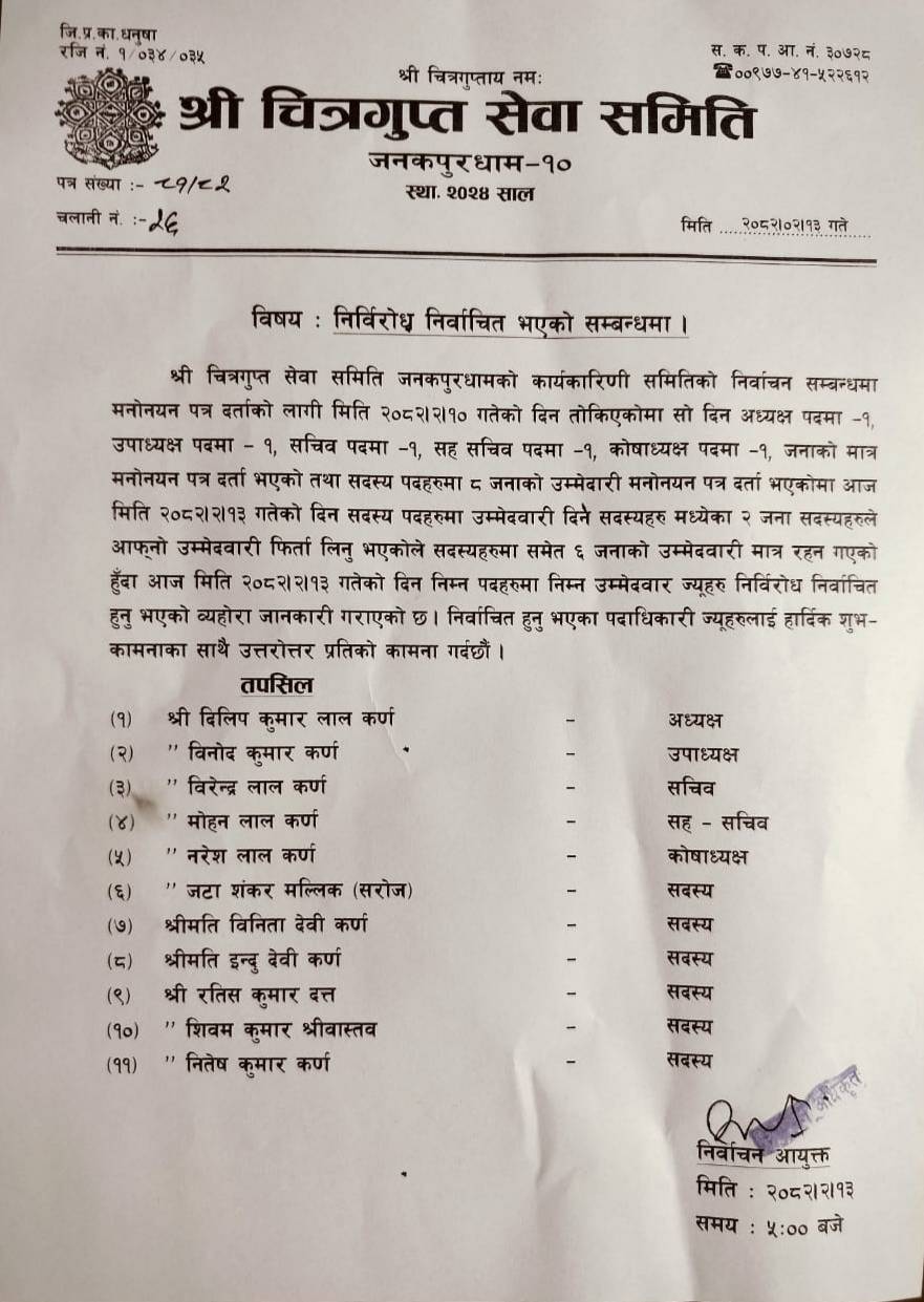 जनकपुरधाम, १३ जेठ । चित्रगुप्त सेवा समिति जनकपुरधामको कार्यकारिणी समितिमा सबै पदाधिकारी निर्विरोध निर्वाचित भएका छन् ।