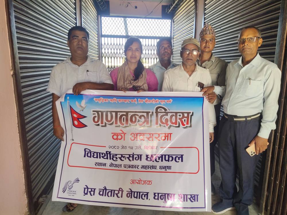 कार्यक्रमको अध्यक्षता प्रेस चौतारी नेपाल धनुषाका सह–सचिव दिवाकर रायले गरेका थिए । प्रेस चौतारी नेपालका केन्द्रीय सदस्य अवधेश कामत प्रमुख अतिथिका रूपमा सहभागी थिए । उनले गणतन्त्रको स्थापनाबाट आजसम्मको यात्रा, यसको संवैधानिक मूल्य र समावेशी लोकतन्त्रमा युवाको भूमिकाबारे आफ्नो धारणा राखे ।