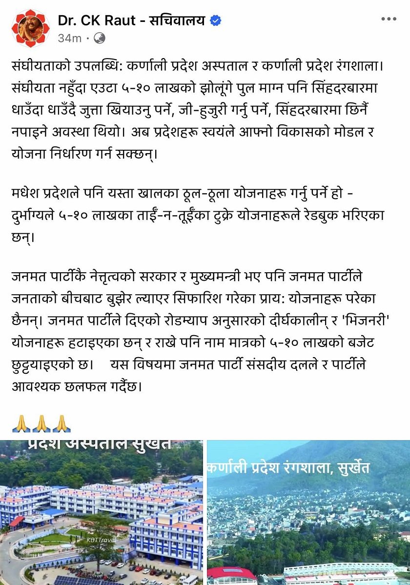 उनले लेखेका छन्, ‘संघीयताको उपलब्धि भनेको कर्णाली प्रदेशमा अस्पताल वा रंगशालाजस्ता ठूला पूर्वाधार हुनु हो । तर, दुर्भाग्यवश मधेश प्रदेशमा अझै पनि ५–१० लाखका टुक्रे योजनाले रेडबुक भरिएको छ ।’