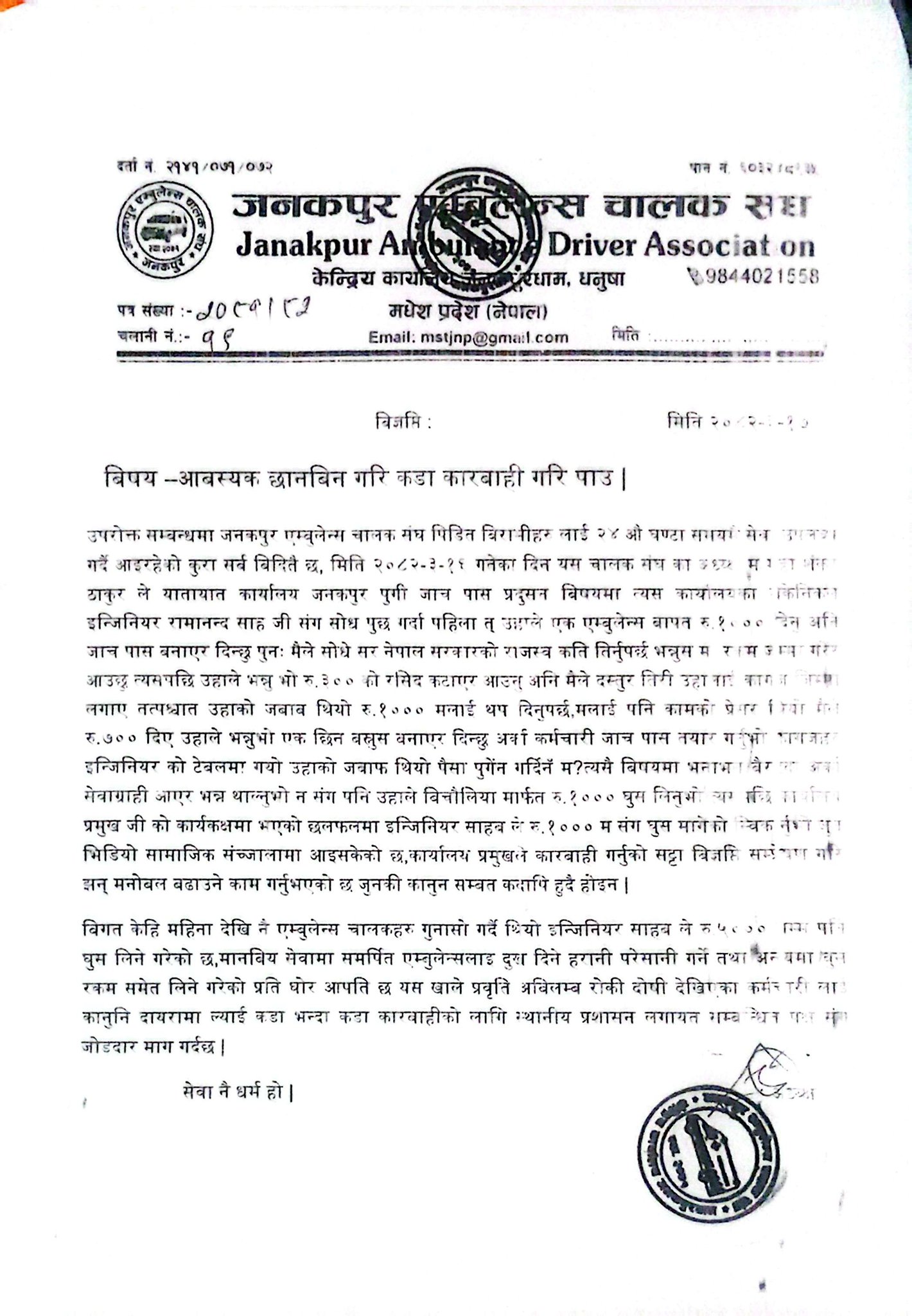 जनकपुरधाम, १७ असार । जनकपुर एम्बुलेन्स चालक संघले यातायात व्यवस्था कार्यालय जनकपुरका इन्जिनियर रामानन्द साहमाथि घुस मागेको आरोप लगाउँदै आवश्यक छानबिनसहित कडा कारबाहीको माग गरेको छ ।