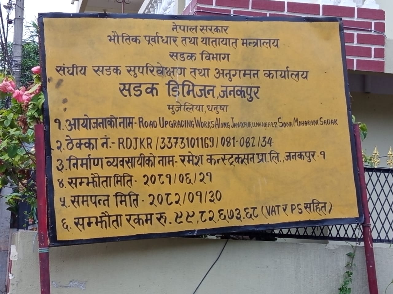 भौतिक पूर्वाधार तथा यातायात मन्त्रालय अन्तर्गतको सडक विभागले सार्वजनिक गरेको विवरणअनुसार ‘रोड अपग्रेडिङ एलङ्ग जनकपुरधाम उपमहानगरपालिका–२, सोना महारानी सडक’ आयोजनाको ठेक्का रमेश कन्स्ट्रक्सन प्रा.लि. जनकपुर–१ ले पाएको थियो ।