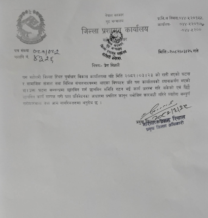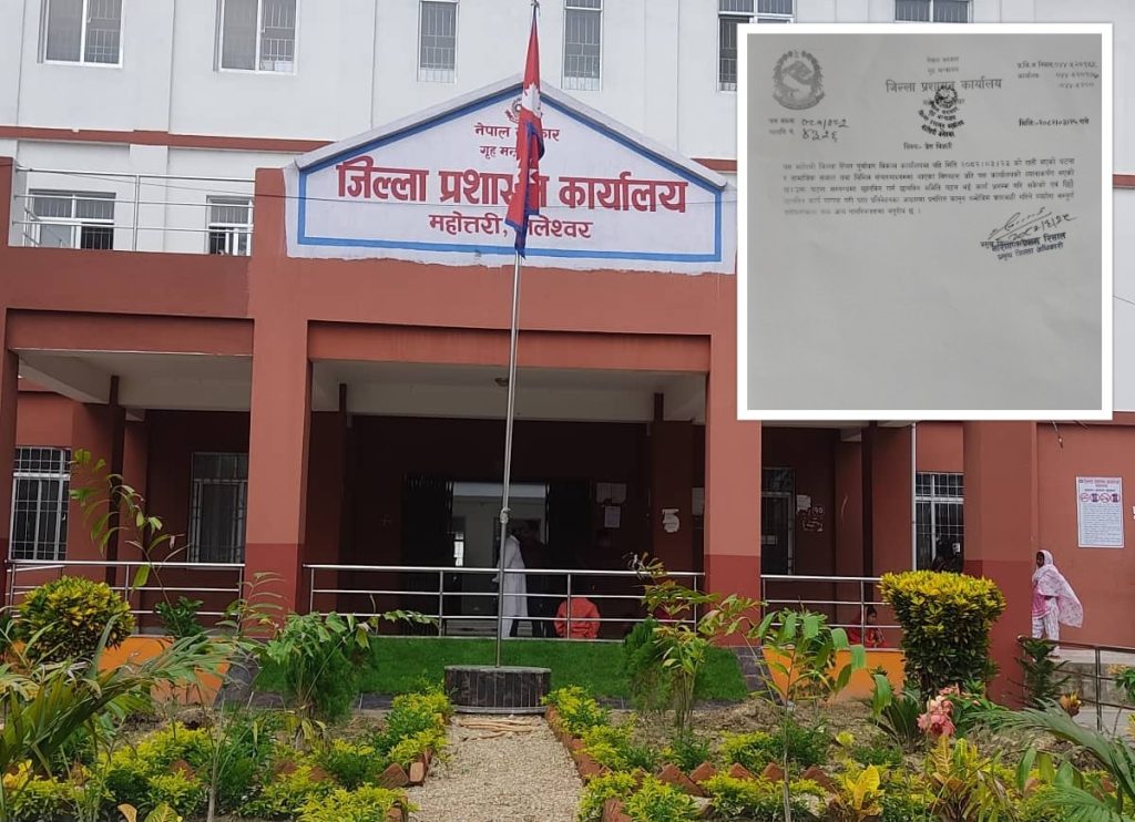 महोत्तरी, २५ असार । महोत्तरीस्थित पुर्वाधार विकास कार्यालयमा असार २३ गते राति भएको घटनाप्रति जिल्ला प्रशासन कार्यालय महोत्तरीले गम्भीर ध्यानाकर्षण भएको जनाएको छ ।