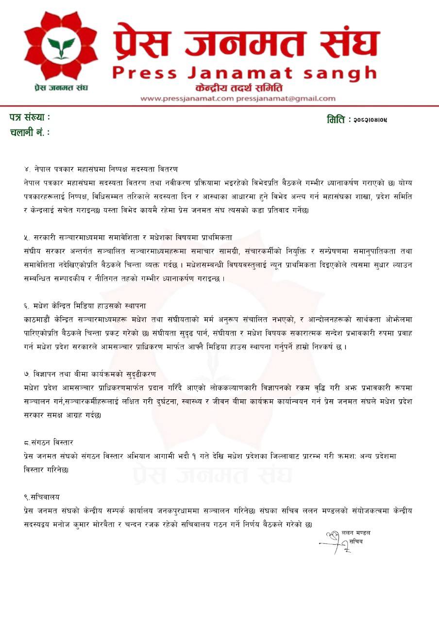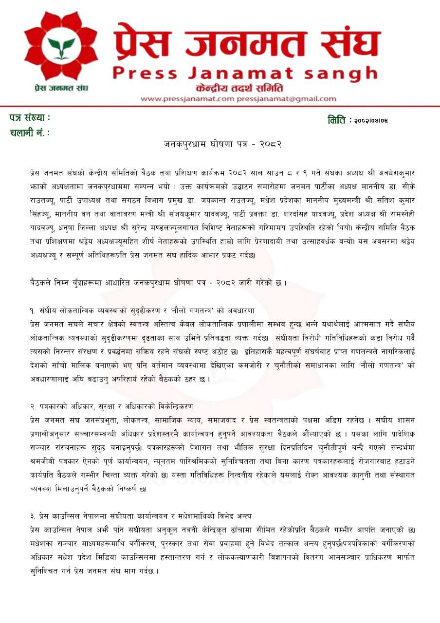 प्रेस जनमत संघको बैठकबाट ९ बुँदे ‘जनकपुरधाम घोषणा पत्र’ जारी