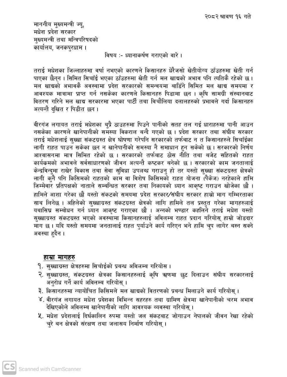 उक्त पत्रमा उनीहरूले मधेशमा जल संकट, कृषि समस्या, चुरे दोहन, अव्यवस्थित क्रसर उद्योग र सिंचाइ अवरोधजस्ता गम्भीर विषयहरूमाथि सरकारको ध्यानाकर्षण गराएका हुन् ।