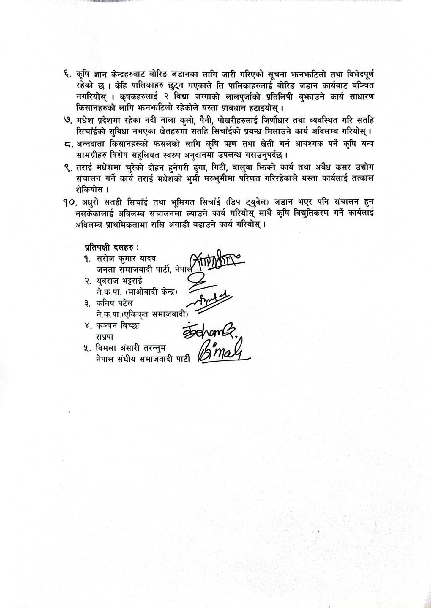 त्यसैगरी, प्रदेशभर रहेका नदी, नहर, तलाउ र अन्य सतही सिंचाइ स्रोतको जिर्णोद्धार गर्दै अधुरा योजनाहरू सम्पन्न गर्नुपर्ने माग पनि राखिएको छ । ध्यानाकर्षण पत्र बुझाएकोबारे जानकारी दिँदै जसपा नेपालका प्रमुख सचेतक रामअशिष यादवले भने, ‘मधेशको किसान, पानी र वातावरणका सवालमा सरकार उदासिन देखिएको छ । हामी यिनै मुद्दामा दबाब दिन आएको हौं ।’