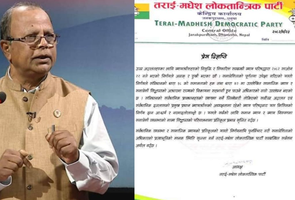 तमलोपाका अध्यक्ष वृषेशचन्द्र लालद्वारा जारी विज्ञप्तिमा २०८२ साउन २२ गते न्याय परिषदले गरेको न्यायाधीश नियुक्ति र सिफारिससम्बन्धी निर्णयप्रति असन्तुष्टि व्यक्त गरिएको छ । विज्ञप्तिमा सो निर्णयले संविधानको धारा १८ अन्तर्गतको समानताको हक र धारा ४२ मा उल्लेखित सामाजिक न्याय तथा समावेशी सिद्धान्तको ठाडो उल्लंघन गरेको आरोप लगाइएको छ ।