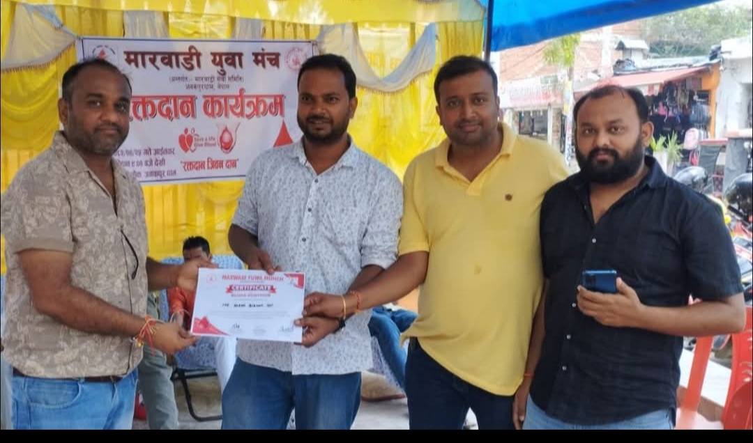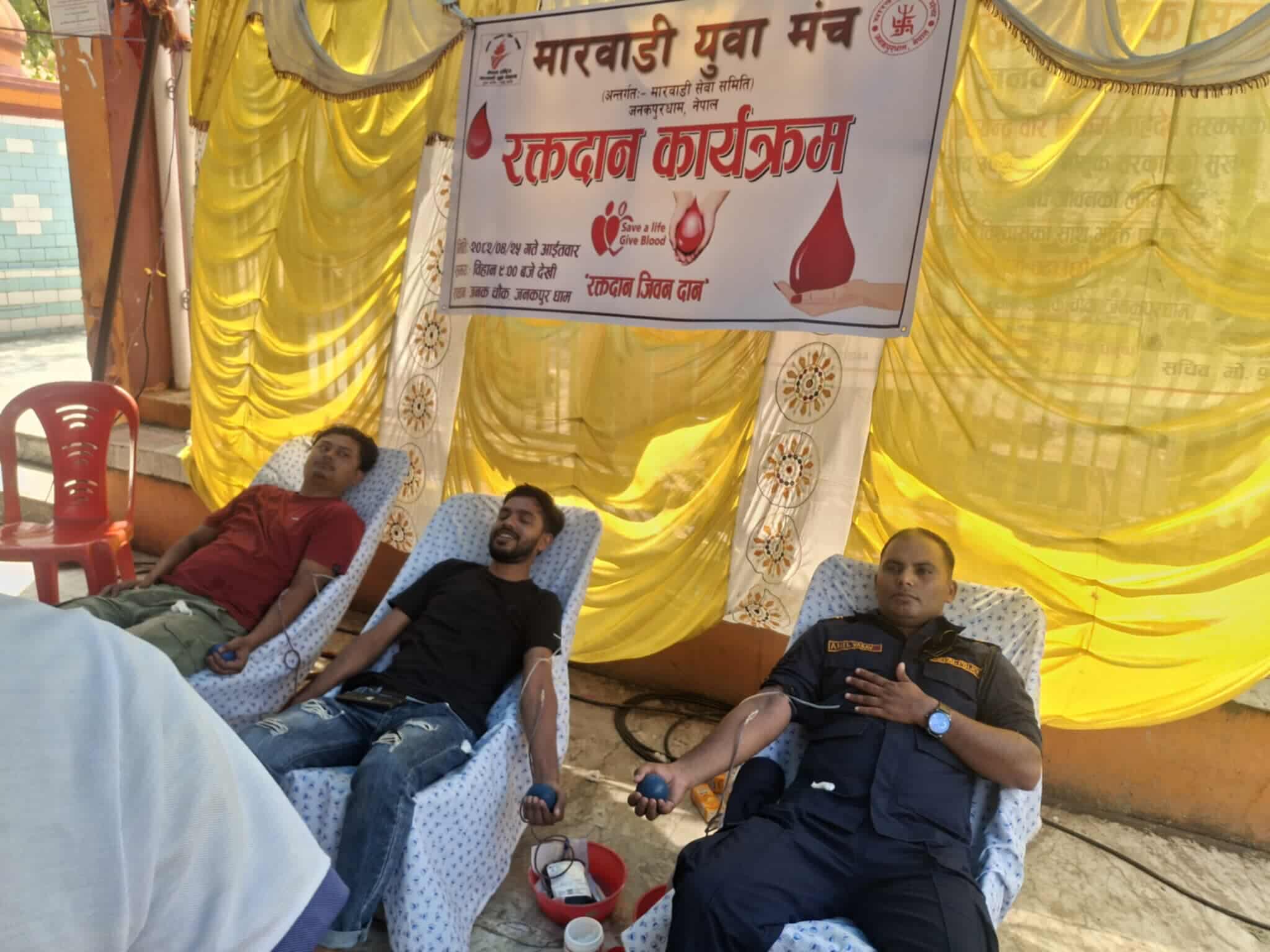 जनकपुरधाम, २५ साउन । अन्तर्राष्ट्रिय युवा दिवसको अवसरमा मारवाडी युवा मञ्च जनकपुरधामले आइतबार जनक चौकमा रक्तदान कार्यक्रमको आयोजना गरेको छ ।