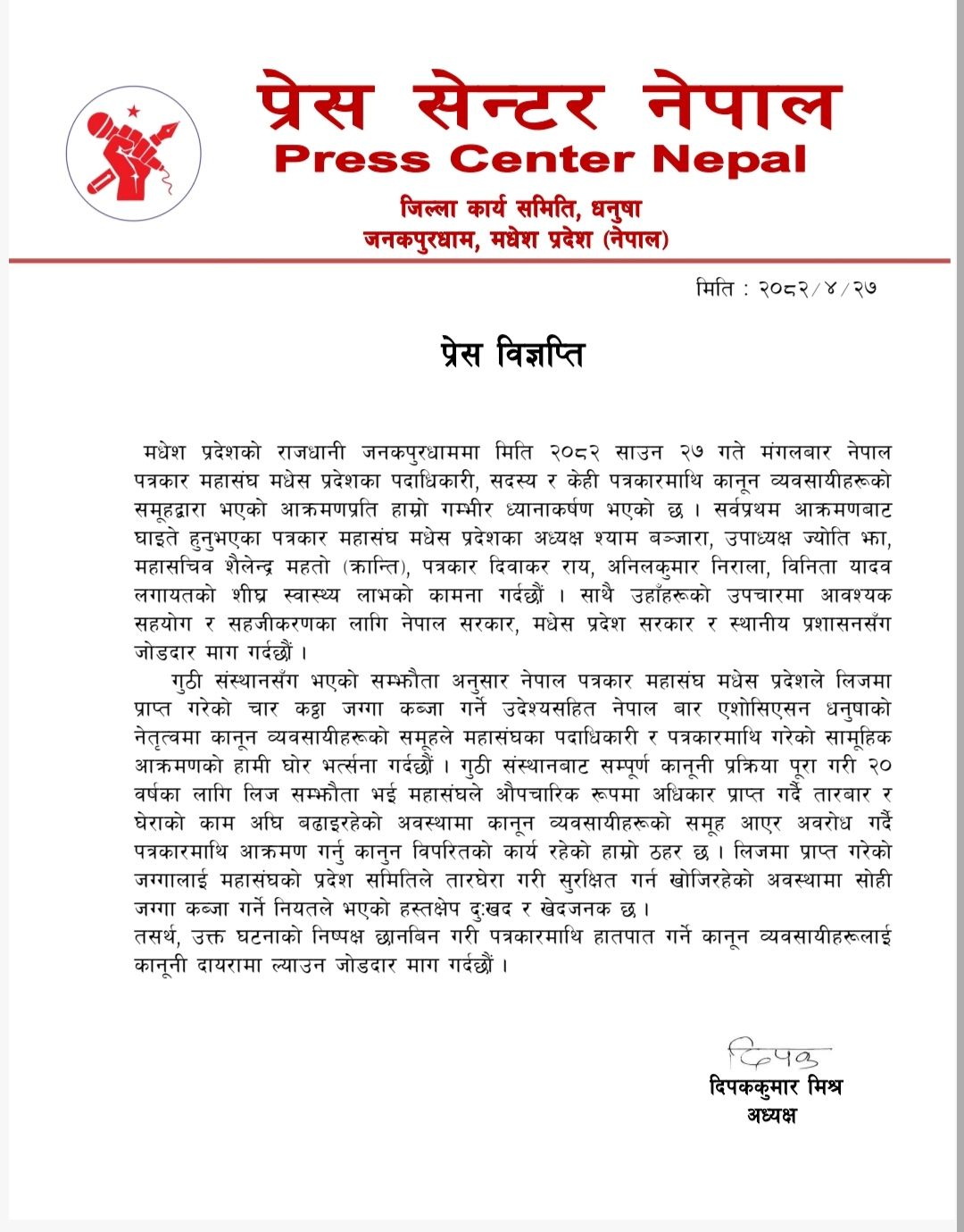 जनकपुरधाम, २७ साउन । मधेश प्रदेशको राजधानी जनकपुरधाममा नेपाल पत्रकार महासंघ मधेस प्रदेशका पदाधिकारी तथा पत्रकारमाथि कानून व्यवसायीहरूको समूहले गरेको सामूहिक आक्रमणप्रति प्रेस सेन्टर नेपाल, धनुषाले गम्भीर ध्यानाकर्षण गरेको छ ।