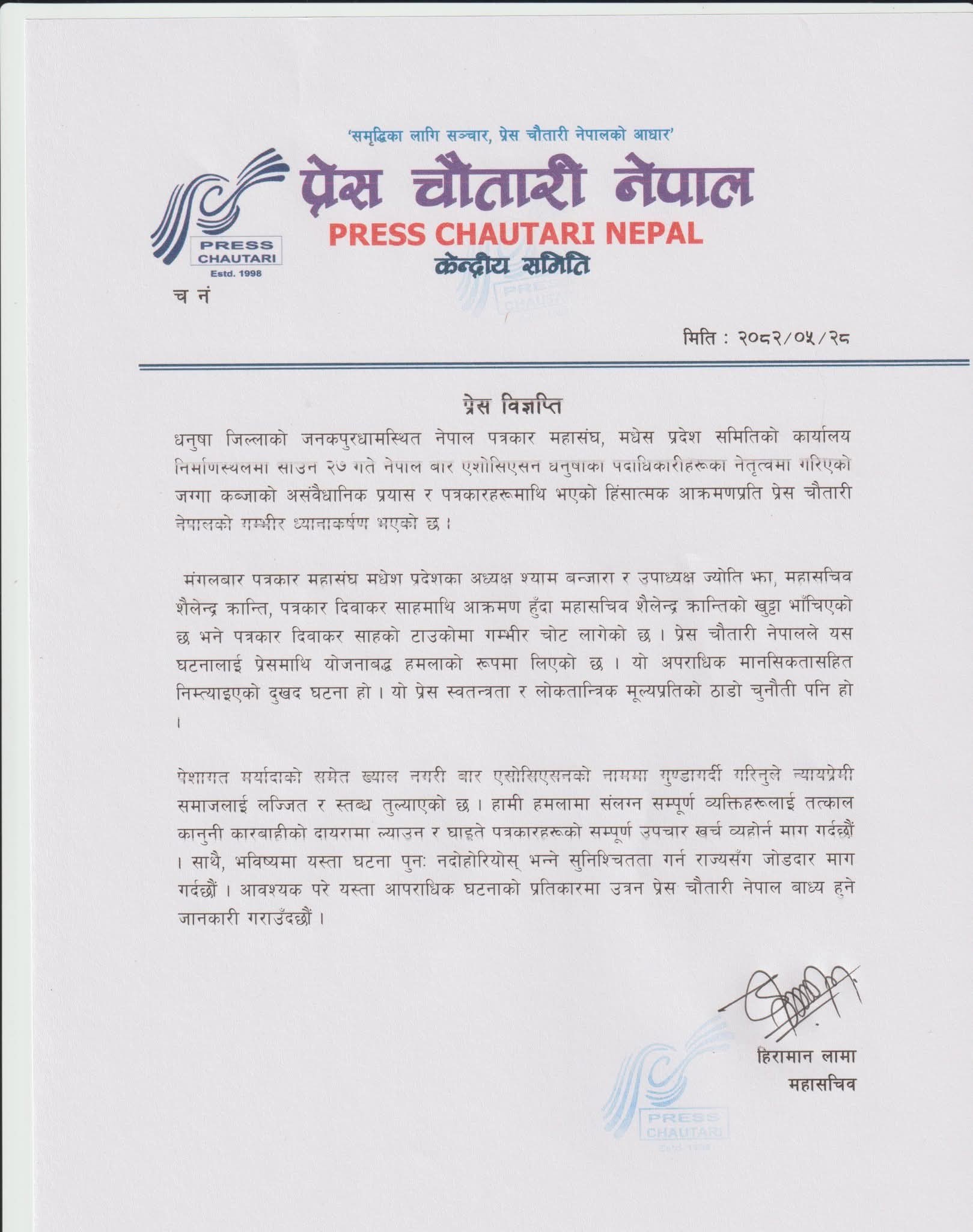 जनकपुरधाम, २८ साउन । जनकपुरधामस्थित नेपाल पत्रकार महासंघ मधेश प्रदेश समितिको कार्यालय निर्माणस्थलमा मंगलबार नेपाल बार एशोसिएसन धनुषाका पदाधिकारीहरूको नेतृत्वमा गरिएको पत्रकारमाथिको आक्रमणप्रति प्रेस चौतारी नेपालले गम्भीर ध्यानाकर्षण गरेको छ ।