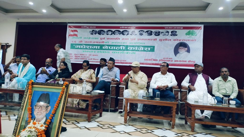 जनकपुरधाम, २८ साउन । नेपाली काँग्रेसका पूर्वसभापति तथा पूर्वप्रधानमन्त्री स्व. सुशील कोइरालाको ८६औँ जन्मजयन्तीको अवसरमा सामाजिक लोकतन्त्र अध्ययन केन्द्रले बुधबार जनकपुरधाममा ‘मधेशमा नेपाली काँग्रेस’ विषयक अन्तरसंवाद कार्यक्रम सम्पन्न गरेको छ ।