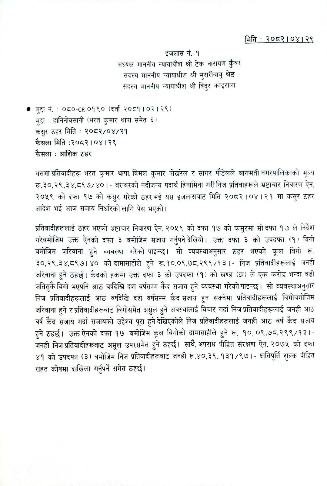 न्यायाधीश टेक नारायण कुँवर, मुरारीबाबु श्रेष्ठ र विदुर कोइरालाको संयुक्त इजलासले भ्रष्टाचार निवारण ऐन, २०५९ को दफा १७ बमोजिम बागमती नगरपालिकाका निलम्बित नगरप्रमुख भरत कुमार थापा, तत्कालीन प्रमुख प्रशासकीय अधिकृत विमल कुमार पोखरेल र सागर पौडेललाई दोषी ठहर गरेको हो ।