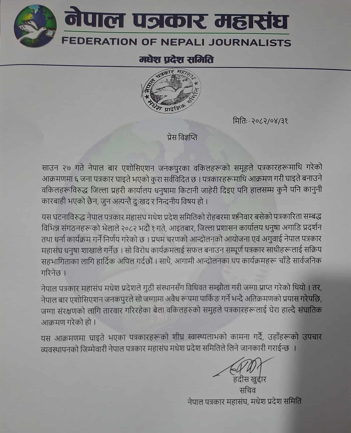 जनकपुरधाम, ३१ साउन । साउन २७ गते नेपाल बार एसोसिएशन जनकपुरका वकिलहरूको समूहले मधेश प्रदेशका पत्रकारहरूलाई घेराबन्दी गर्दै सामूहिक आक्रमण गरेको घटनामा ६ जना पत्रकार घाइते भएका थिए । आक्रमणविरुद्ध जिल्ला प्रहरी कार्यालय धनुषामा किटानी जाहेरी दर्ता भए पनि अहिलेसम्म कुनै पनि कानुनी कारबाही नभएको नेपाल पत्रकार महासंघ मधेश प्रदेश समितिले जनाएको छ ।