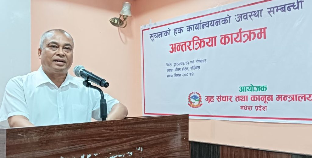 जनकपुरधाम, ३ भदौ । मधेश प्रदेशका गृह, सञ्चार तथा कानुन मन्त्री राजकुमार लेखीले सूचनाको हकलाई लोकतन्त्रको मेरुदण्डको रूपमा व्याख्या गर्दै यसलाई प्रभावकारी रूपमा कार्यान्वयन नगरी पारदर्शिता, सुशासन र सभ्य समाज निर्माण सम्भव नहुने स्पष्ट पारेका छन् ।