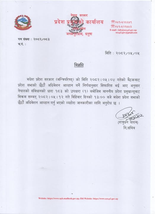 मधेश प्रदेश सभाको छैठौं अधिवेशन आह्वान