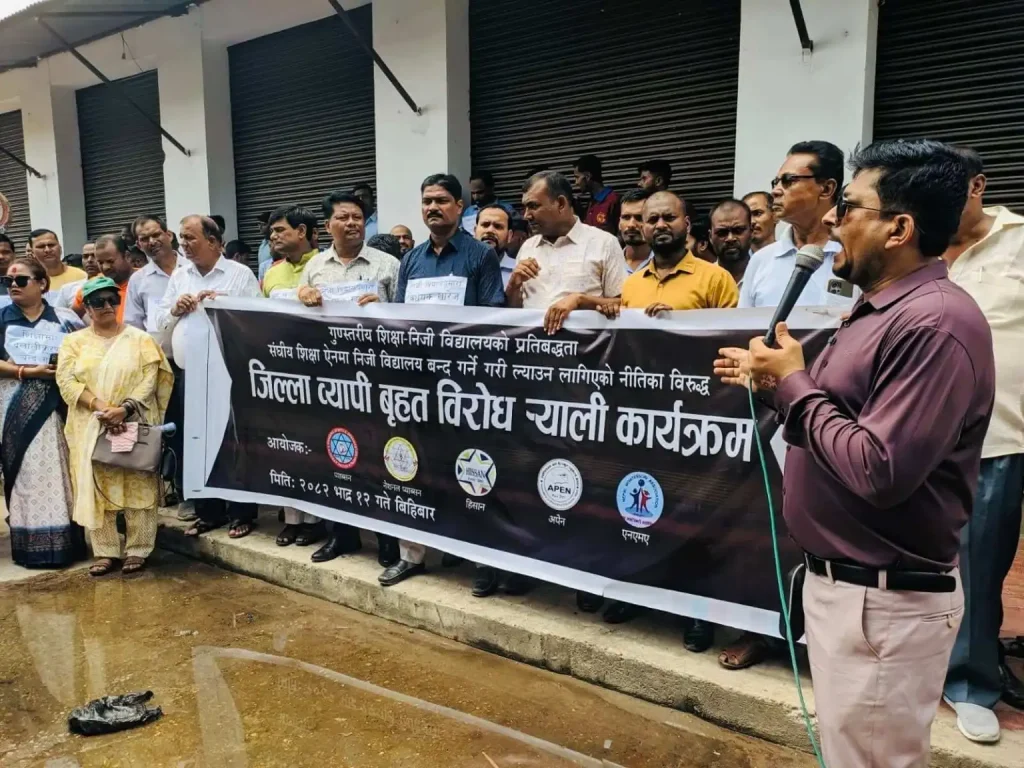 प्याब्सन, नेशनल प्याब्सन, हिसान, अपेनलगायतका निजी तथा आवासीय विद्यालय सञ्चालक संगठनहरूको संयुक्त आयोजनामा भएको विरोध ¥याली पुरानो बसपार्कबाट सुरु भई शहरका विभिन्न मार्ग परिक्रमा गर्दै जिल्ला प्रशासन कार्यालय अगाडि कोण सभामा परिणत भएको हो ।