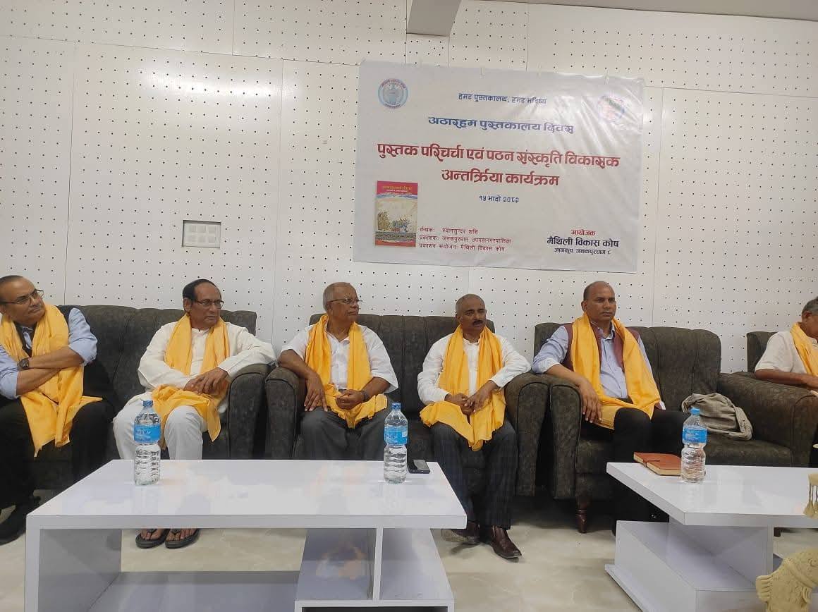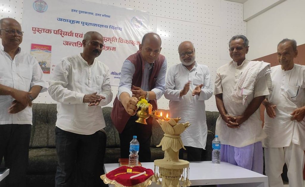 जनकपुरधाम, १६ धदौ । ‘हाम्रो पुस्तकालय, हाम्रो भविष्य’ नारासहित मैथिली विकास कोष जनकपुरधामको आयोजनामा अठारौँ पुस्तकालय दिवस भव्य रूपमा मनाइएको छ । कार्यक्रममा ‘पठन संस्कृतिको विकास’ शीर्षकमा विशेष परिचर्चा हुनुका साथै साहित्यकार श्यामसुन्दर शशिद्वारा लिखित पुस्तक ‘जनकपुरधामक इतिहास’ माथि विमर्श गरिएको थियो ।