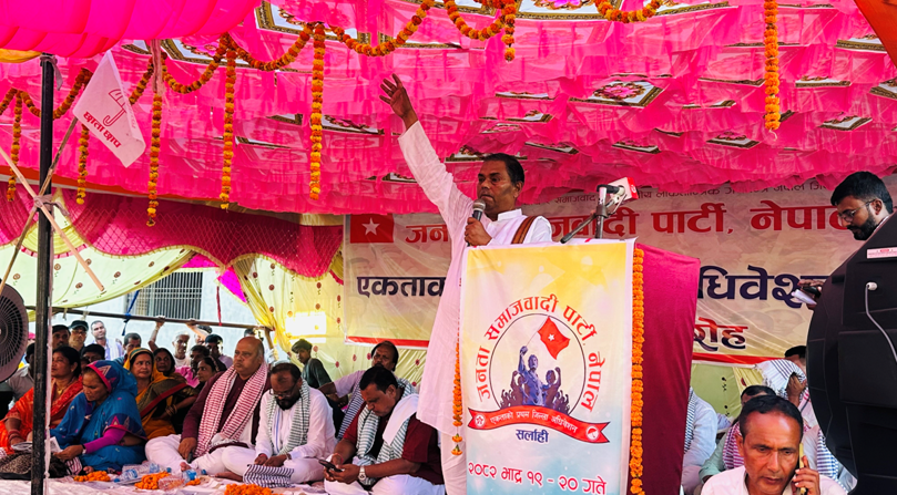 अध्यक्ष यादवले भने, ‘सुकुम्वासी व्यवस्थापनका नाममा वर्तमान सरकारले ल्याउने भूमि विधेयकले मधेशको जल, जंगल र जमीन सखाप पार्ने योजना बनाएको छ । चुरे विनाश गरेर बालुवा, ढुंगा–गिटीको अवैध कारोबारबाट केही व्यक्तिहरू अरबपति बनेका छन् भने चुरे विनाशले भूमिगत पानीको सतह समाप्त हुँदै गएको छ । जनता पानी नपाएर दुःख भोगिरहेका छन् ।’