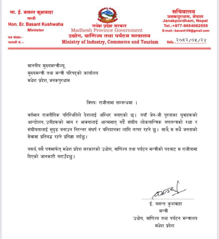 कुशवाहाले राजीनामामा भनेका छन्, ‘मधेश प्रदेशको स्थिरता, संघीय लोकतन्त्रको संरक्षण र युवाहरूको मागको सम्मानका लागि यो निर्णय आवश्यक भएको हो ।’