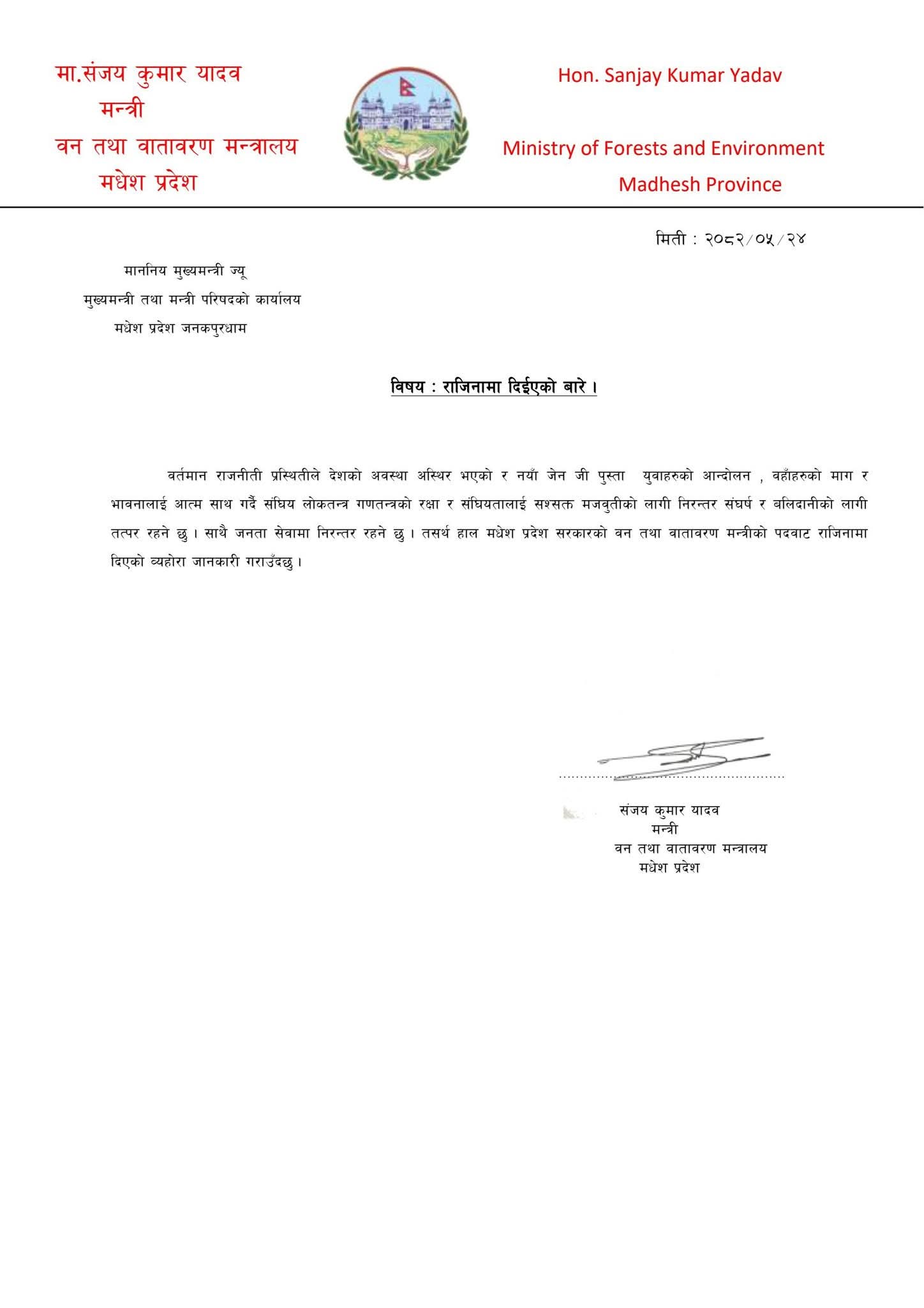 यादवले भने, ‘म सधैं जनताको सेवामा प्रतिबद्ध रहने छु । यही दृष्टिकोणका आधारमा मैले वन तथा वातावरण मन्त्रालयको मन्त्री पदबाट राजीनामा दिएको जानकारी गराउँछु ।’