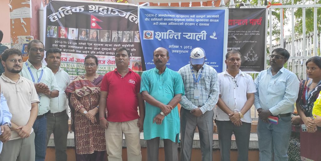 जनकपुरधाम, १ असोज । हालैको ‘जेनजी आन्दोलन’मा ज्यान गुमाउने सम्पूर्ण शहीदहरूको आत्माको चीर शान्तिको कामना र देशमा शान्ति–सुव्यवस्था कायम गर्नुपर्ने मागसहित बुधबार जनकपुरधाममा शान्ति र्याली निकालिएको छ ।