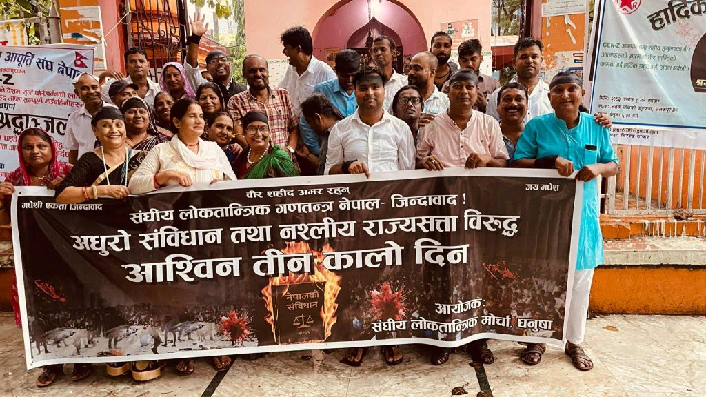 जनकपुरधाम, ३ असोज । संविधान दिवसका दिन संघीय लोकतान्त्रिक मोर्चाले जनकपुरधाममा विरोध कार्यक्रमसहित असोज ३ लाई कालो दिवसका रूपमा मनाएको छ ।