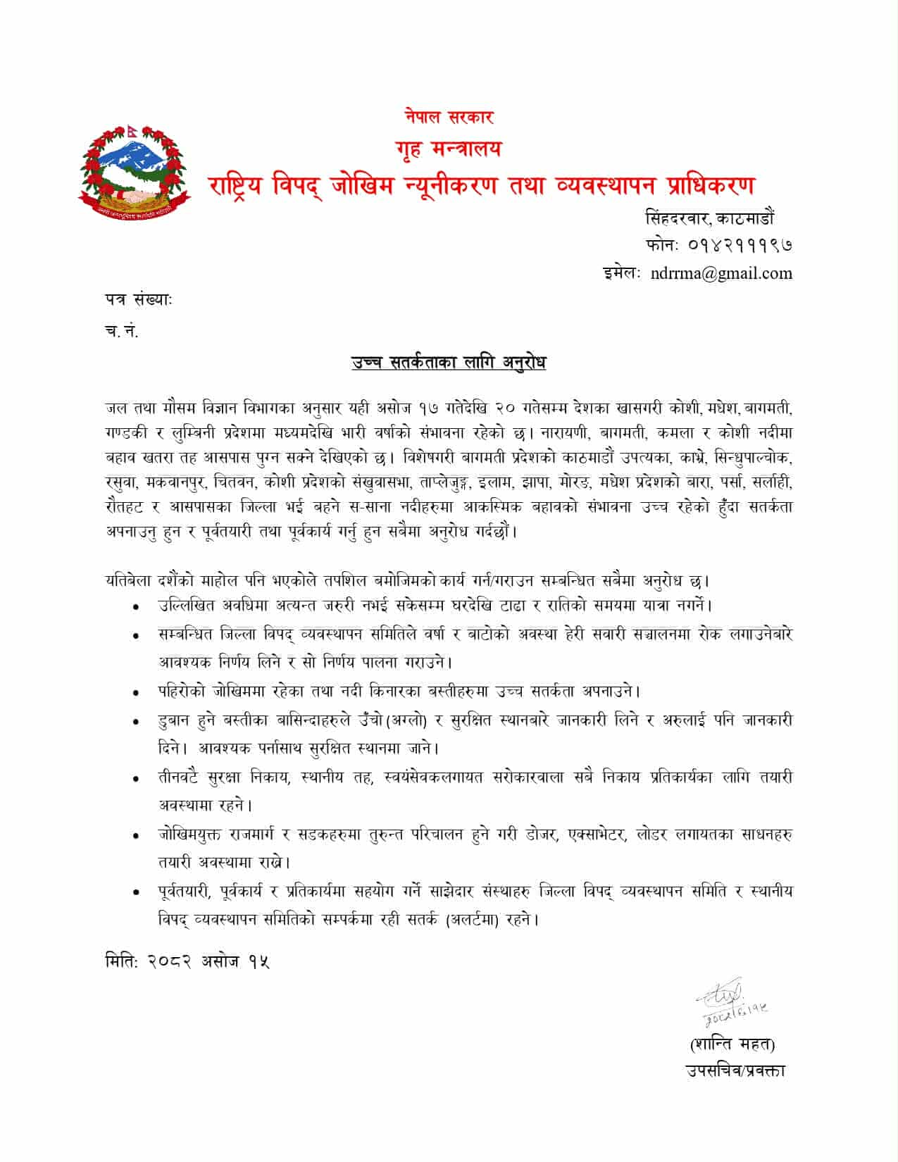 काठमाडौं, १५ असोज । राष्ट्रिय विपद् जोखिम न्यूनीकरण तथा व्यवस्थापन प्राधिकरणले असोज १७ देखि २० गतेसम्म देशका विभिन्न प्रदेशमा भारी वर्षा हुने सम्भावना रहेको भन्दै उच्च सतर्कता अपनाउन आग्रह गरेको छ ।
