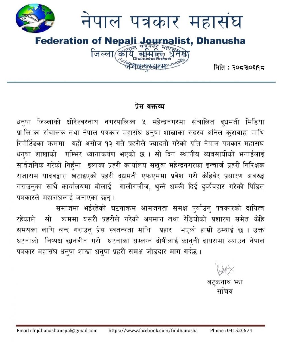जनकपुरधाम, १८ असोज । धनुषा जिल्लाको क्षिरेश्वरनाथ नगरपालिका–५ महेन्द्रनगरस्थित दूधमती मिडिया प्रा.लि. का सञ्चालक तथा नेपाल पत्रकार महासंघ धनुषा शाखाका सदस्य अनिल कुशवाहामाथि प्रहरीद्वारा गरिएको दुर्व्यवहार घटनाले स्थानीय सञ्चार क्षेत्रमा तीव्र प्रतिक्रिया उत्पन्न भएको छ ।