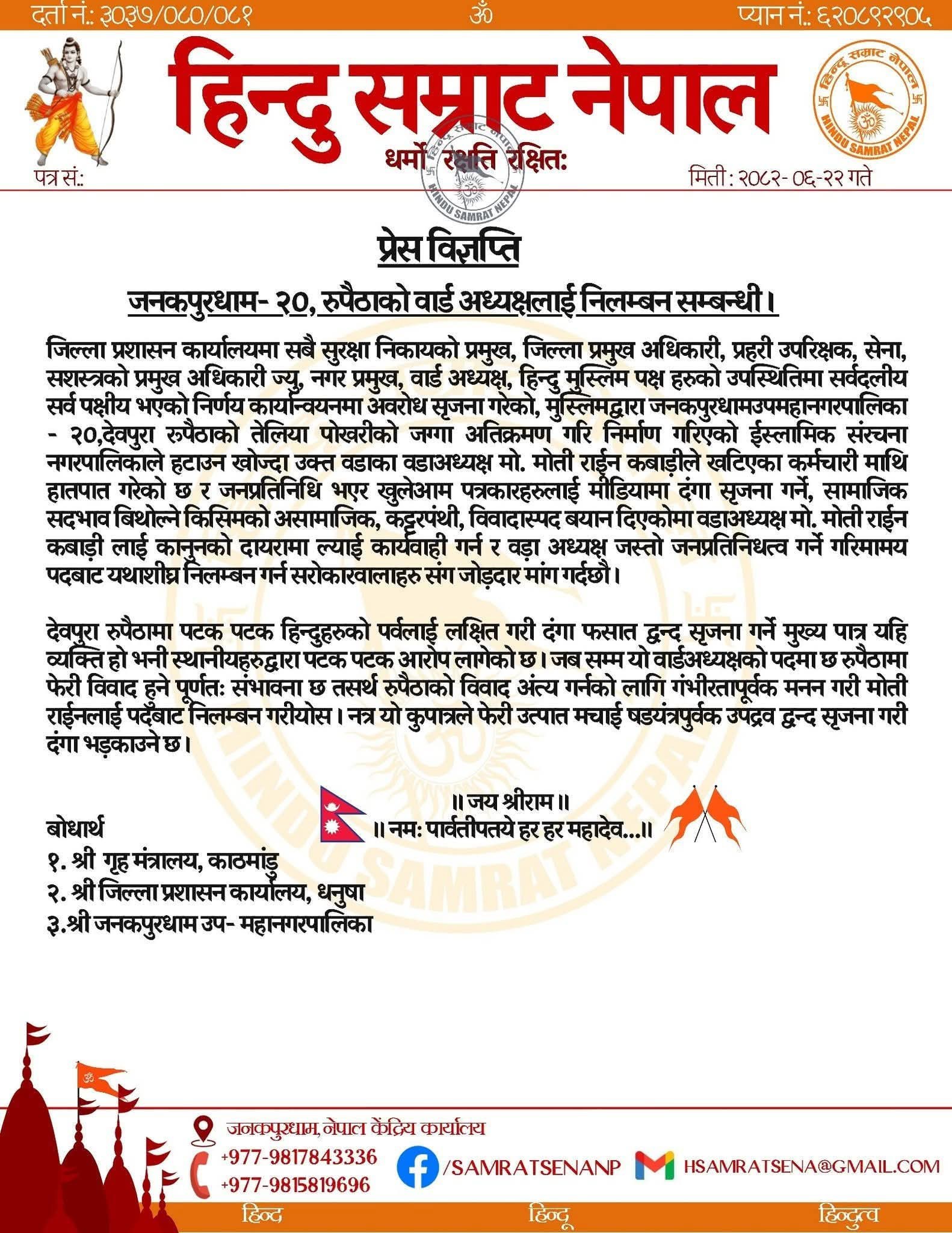 जनकपुरधाम, २२ असोज । हिन्दू सम्राट नेपालले जनकपुरधाम उपमहानगरपालिका–२० का वडाध्यक्ष मोहम्मद मोती राइन ‘कबाड़ी’लाई तत्काल पदमुक्त गर्न माग गरेको छ ।