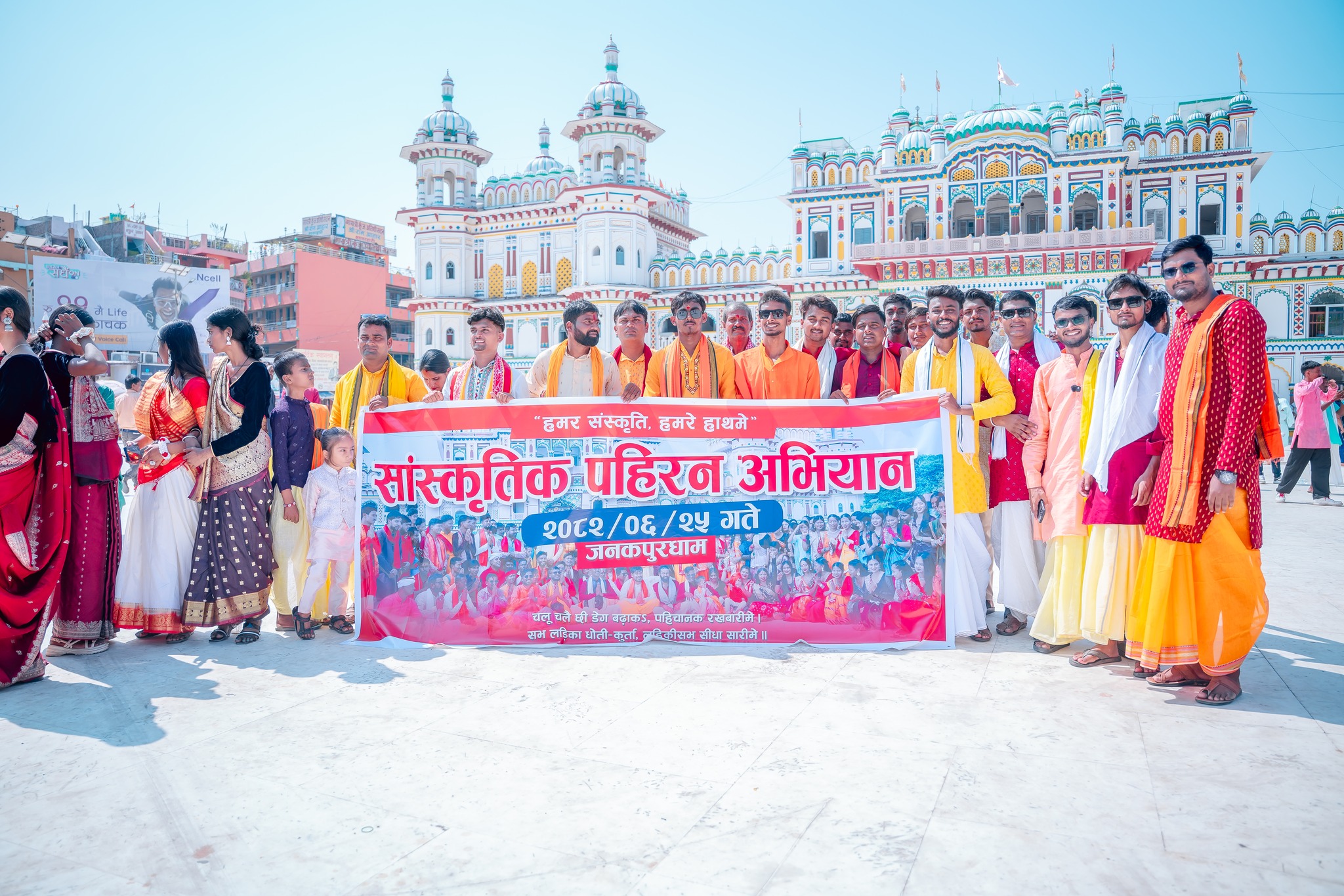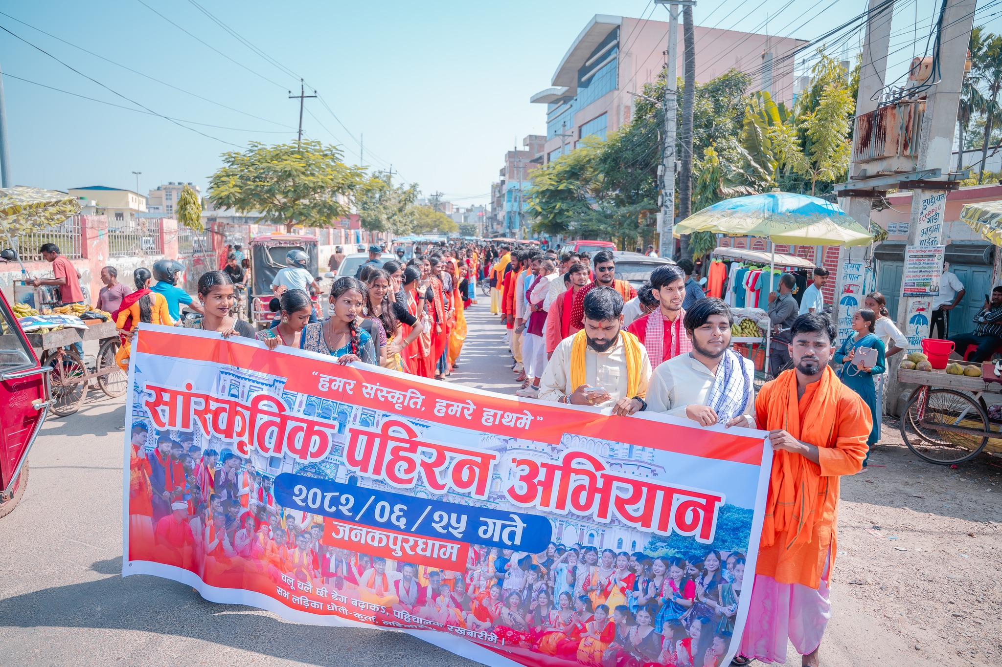 उनीहरूले धोती, कुर्ता र सारी लगाएर मिथिलाको मौलिक पहिरनलाई जगेर्ना गर्ने उद्देश्य राख्दै जनकपुरधामको ऐतिहासिक गंगासागर पोखरीबाट जानकी मन्दिर प्राङ्गणसम्म पैदल मार्च गरेका हुन् ।