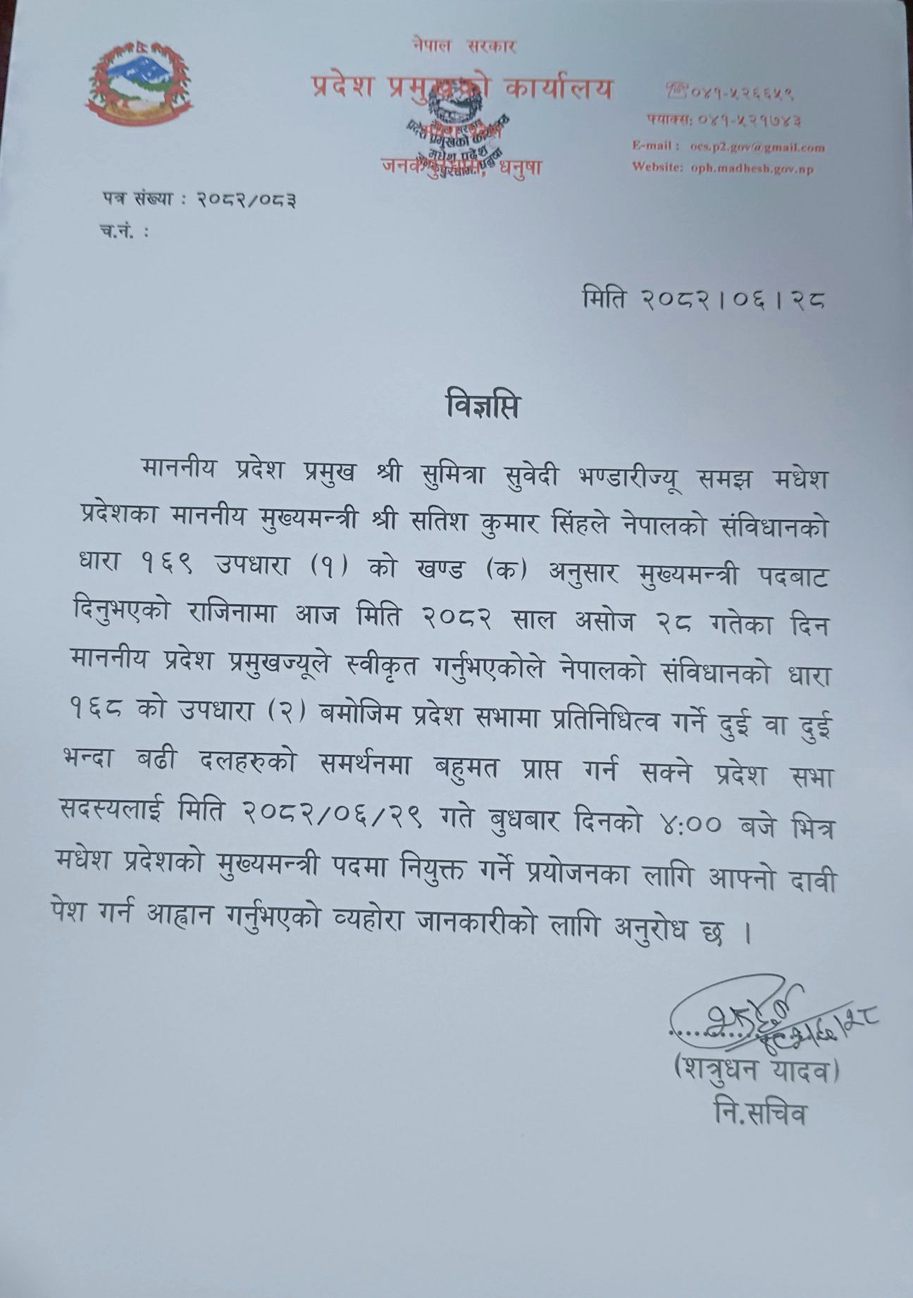 प्रदेश प्रमुखका निजामती सचिव शत्रुधन यादवद्वारा हस्ताक्षरित विज्ञप्तिमा भनिएको छ, ‘नेपालको संविधानको धारा १६९ उपधारा (१०) को खण्ड (क) बमोजिम मुख्यमन्त्री सिंहले दिएको राजीनामा प्रदेश प्रमुखले स्वीकृत गर्नुभएकोले संविधानको धारा १६८ उपधारा (२) अनुसार दुई वा दुईभन्दा बढी दलको समर्थनमा बहुमत प्राप्त गर्न सक्ने प्रदेश सभा सदस्यलाई असोज २९ गते अपराह्न ४ बजेभित्र मुख्यमन्त्री पदमा नियुक्तिका लागि दाबी पेश गर्न आह्वान गरिएको छ ।’