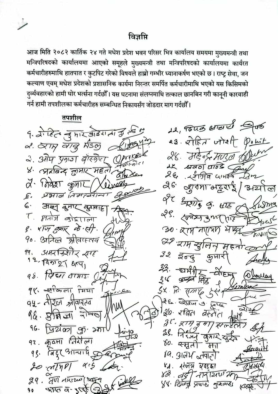 जनकपुरधाम, २४ कार्तिक । मधेश प्रदेशको मुख्यमन्त्री तथा मन्त्रिपरिषद्को कार्यालयमा कार्यरत कर्मचारीमाथि भएको कुटपिट र दुर्व्यवहारको घटनाप्रति प्रदेशका एक सय २१ जना कर्मचारीले संयुक्त रूपमा आपत्ति जनाउँदै दोषीमाथि तत्काल कानूनी कारबाहीको माग गरेका छन् ।