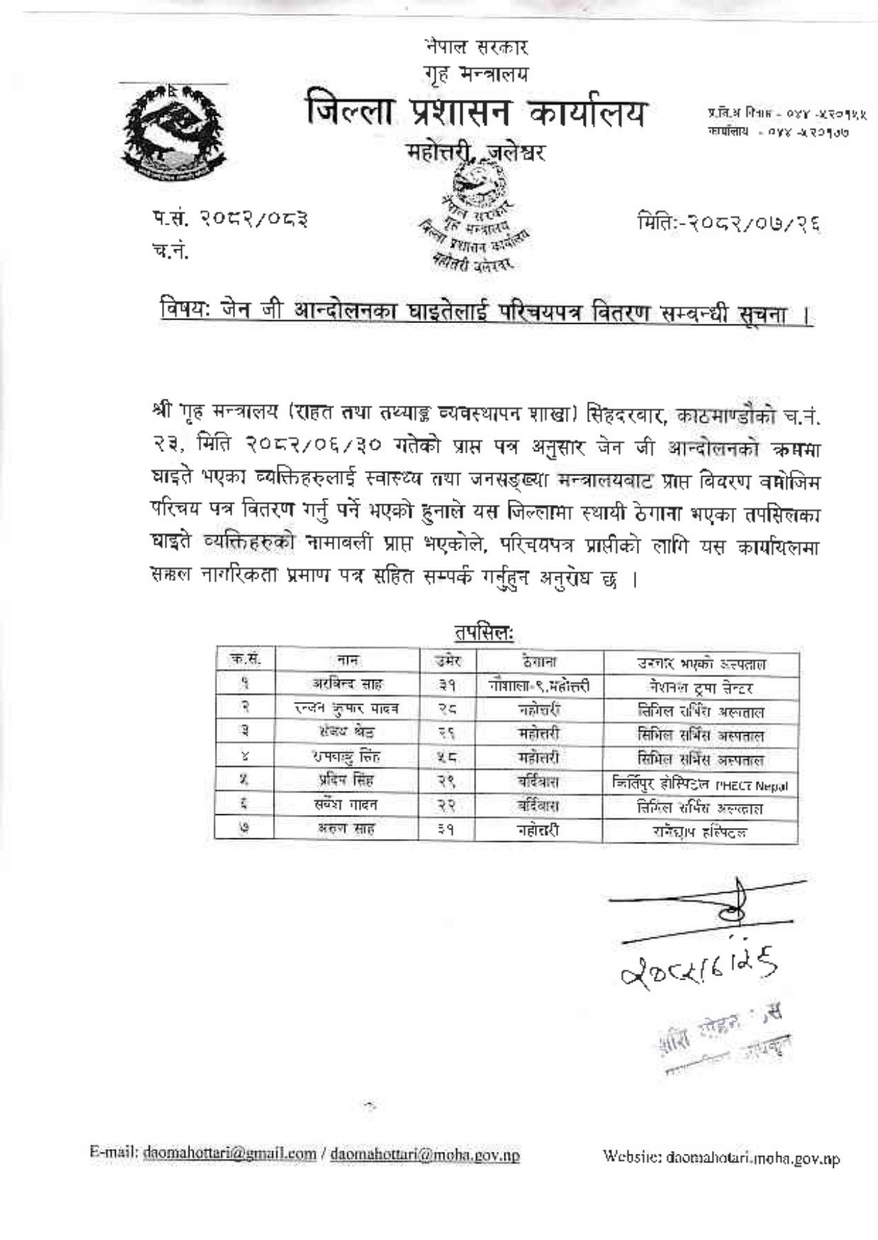 जिल्ला प्रशासन कार्यालय महोत्तरीका सहायक प्रमुख जिल्ला अधिकारीको हस्ताक्षरमा जारी सूचनामा भनिएको छ, ‘गृह मन्त्रालय (राहत तथा तथ्याङ्क व्यवस्थापन शाखा) बाट प्राप्त निर्देशन र स्वास्थ्य तथा जनसङ्ख्या मन्त्रालयको विवरण अनुसार जेनजी आन्दोलनका घाइतेहरूलाई परिचयपत्र वितरण गरिनुपर्ने भएकाले सम्बन्धित व्यक्तिहरूले कार्यालयमा सम्पर्क गरी आफ्नो परिचयपत्र प्राप्त गर्नुपर्नेछ ।’