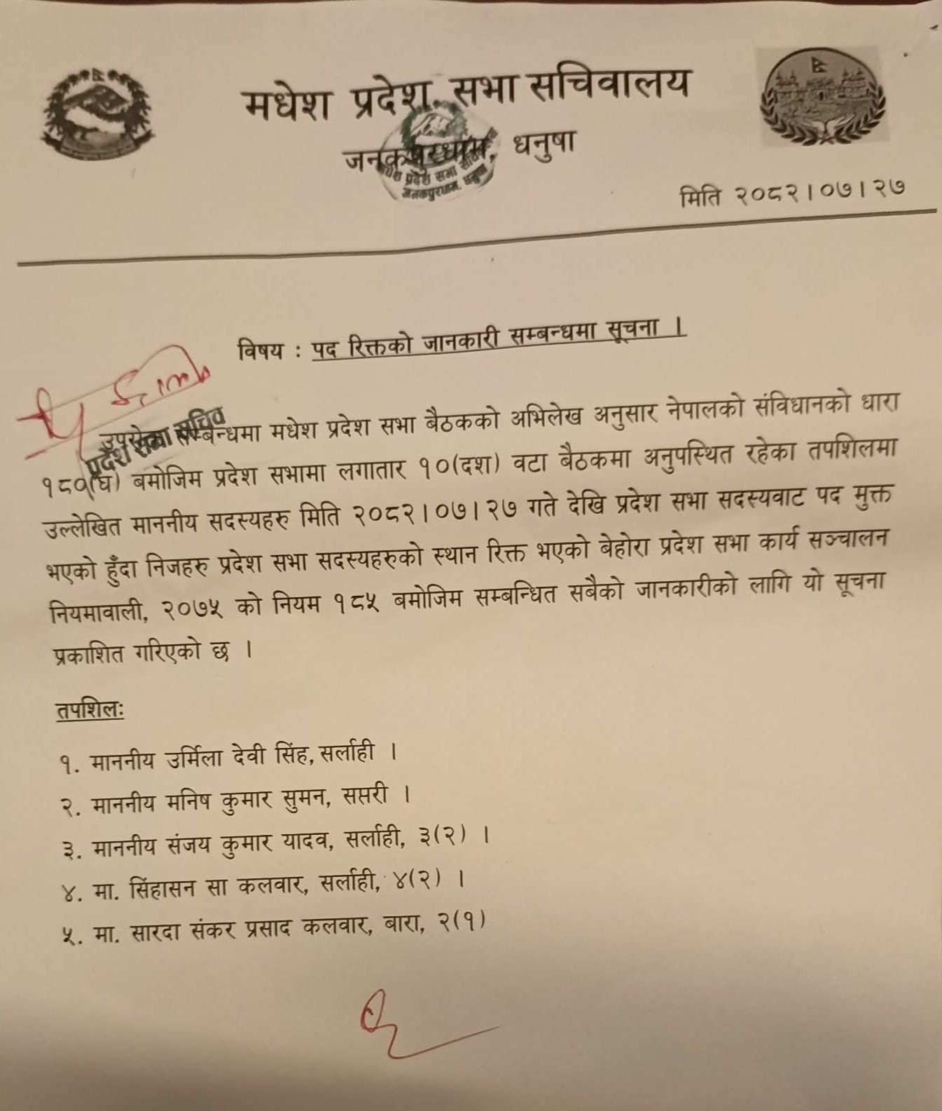 सूचनामा भनिएको छ, ‘संविधानको धारा १८० (घ) अनुसार मधेश प्रदेश सभा बैठकको अभिलेखमा लगातार १० बैठकमा अनुपस्थित रहेका सांसदहरू कार्तिक २७ गतेदेखि प्रदेशसभा सदस्यबाट पदमुक्त भएको हुँदा उनीहरूको पद रिक्त भएको छ । यस निर्णयको सूचना सम्बन्धित सबैको जानकारीको लागि प्रकाशित गरिएको छ ।’