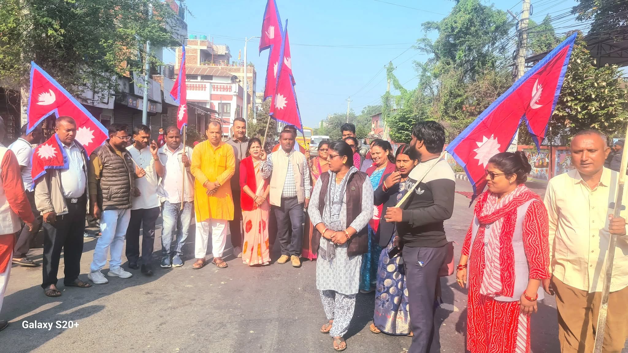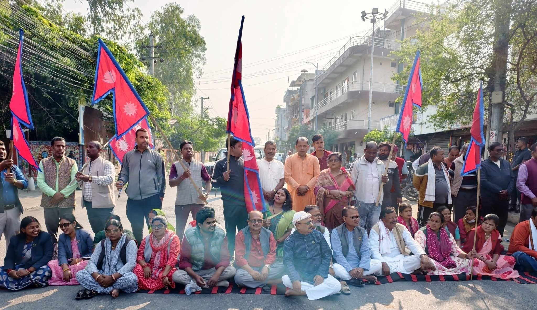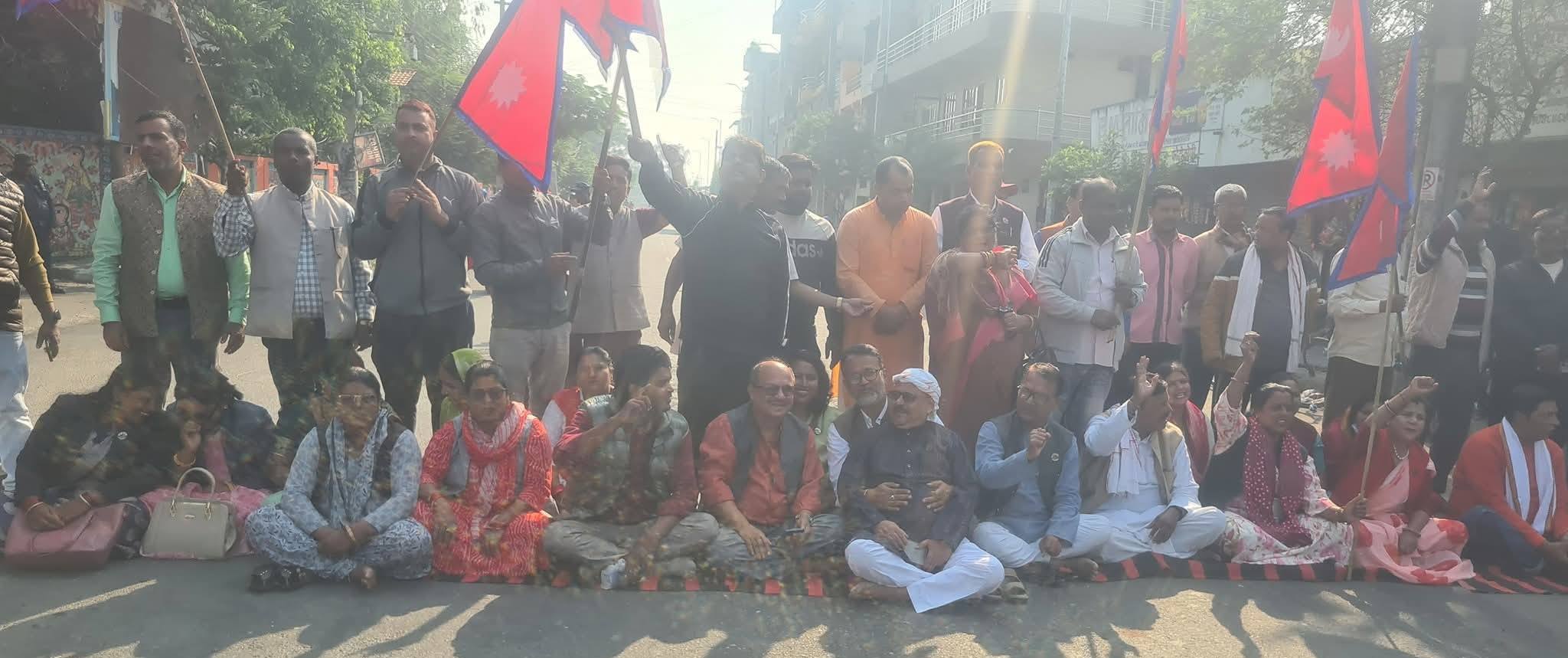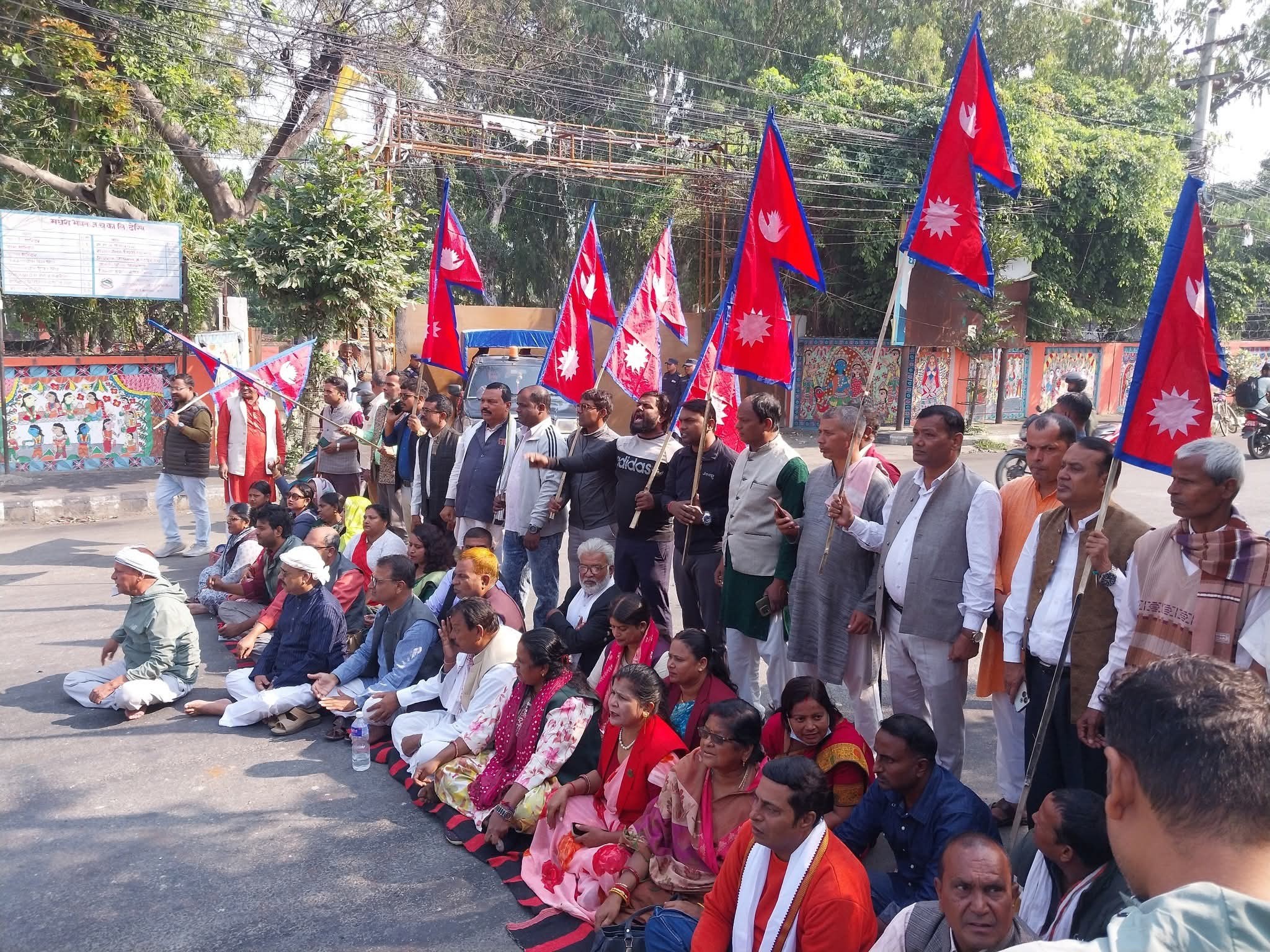 मधेश भवन मुख्यालयअगाडि सात दलका सांसद, नेता तथा कार्यकर्ताहरूले आज पनि राष्ट्रिय झण्डा बोकेर सडक नै बन्द गर्दै शान्तिपूर्ण धर्ना जारी राखेका छन् ।
