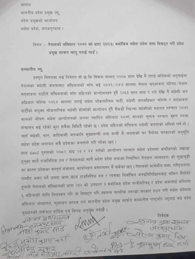 मधेश प्रदेशसभा विघटन गरी प्रदेश प्रमुख शासन लागू गर्न माग