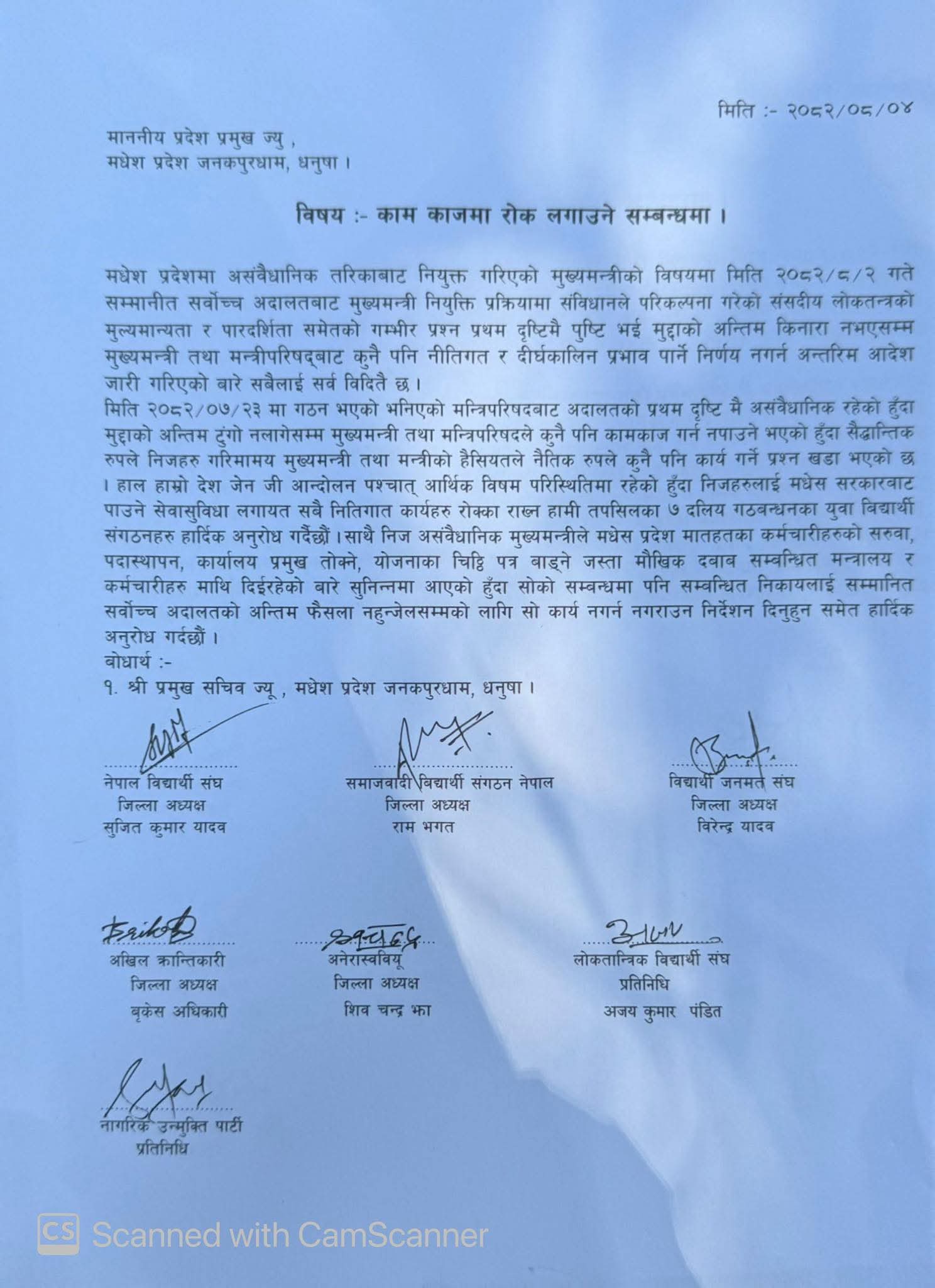 जनकपुरधाम, ४ मंसिर । मधेश प्रदेशमा असंवैधानिक तरिकाले नियुक्त गरिएको भन्दै सात दलीय गठबन्धनसम्बद्ध विद्यार्थी संगठनहरूले बिहीबार प्रदेश प्रमुखलाई ज्ञापनपत्र बुझाएका छन् ।