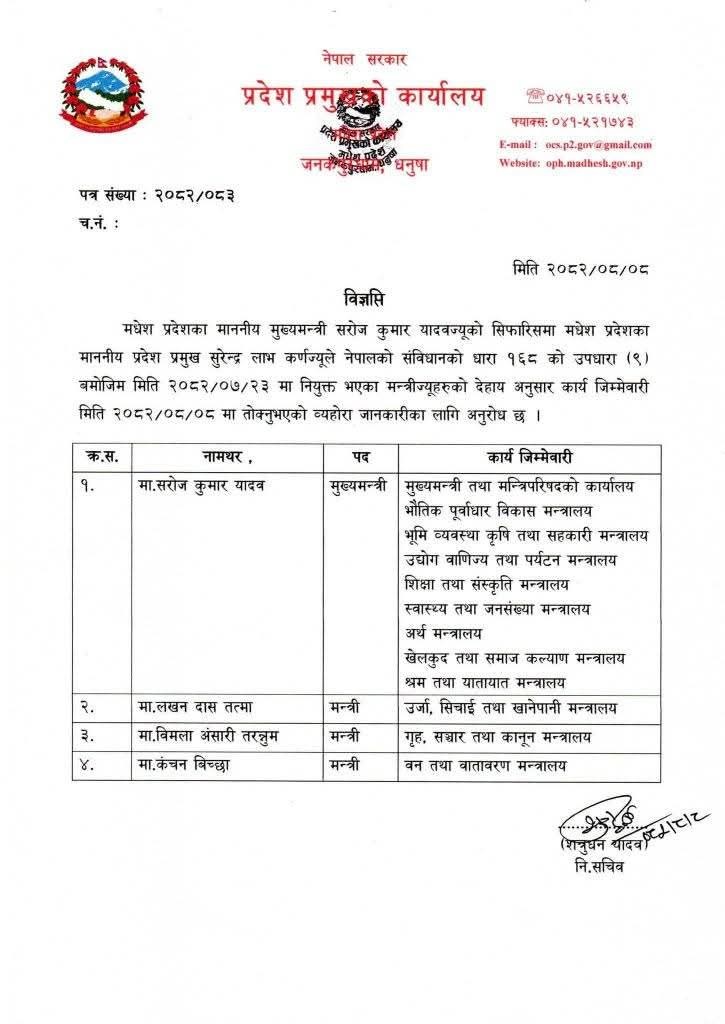 कार्यविभाजन तत्कालै लागू हुने प्रदेश प्रमुख कार्यालयका निमित्त सचिव शत्रुधन यादवद्वारा हस्ताक्षरित विज्ञप्तिमा उल्लेख छ ।
