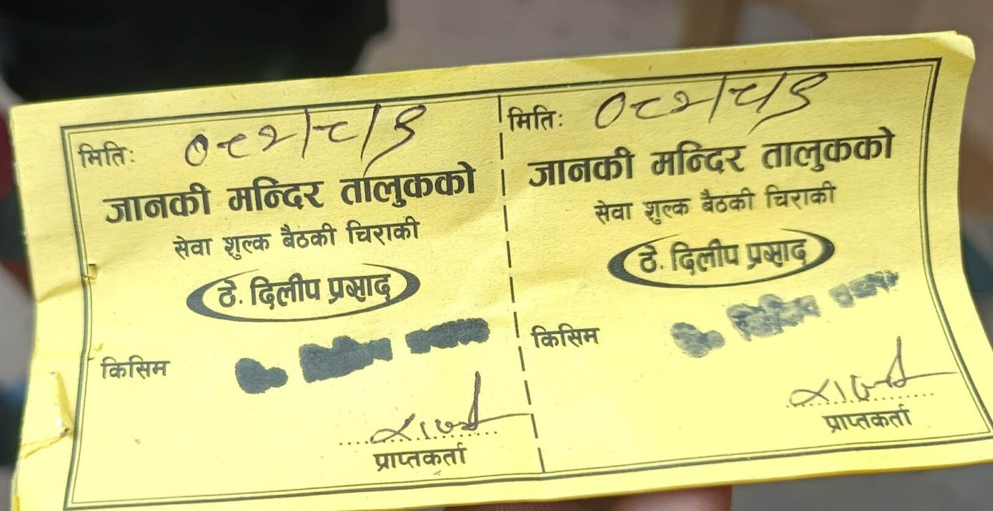 प्राप्त पर्चामा ‘जानकी मन्दिर तालुकको सेवा शुल्क बैठकी चिराकी’ लेखिएको छ । मिति ०८२/८/९ अंकित छ । पर्चामा ‘ठेकेदार दिलीप प्रसाद’ भनेर उल्लेख गरिएको छ । तर, यस प्रकारको शुल्क आधिकारिक रूपमा स्वीकृत भएको वा मन्दिर व्यवस्थापन समितिले नै जारी गरेको हो/होइन भन्ने विषय स्पष्ट छैन ।