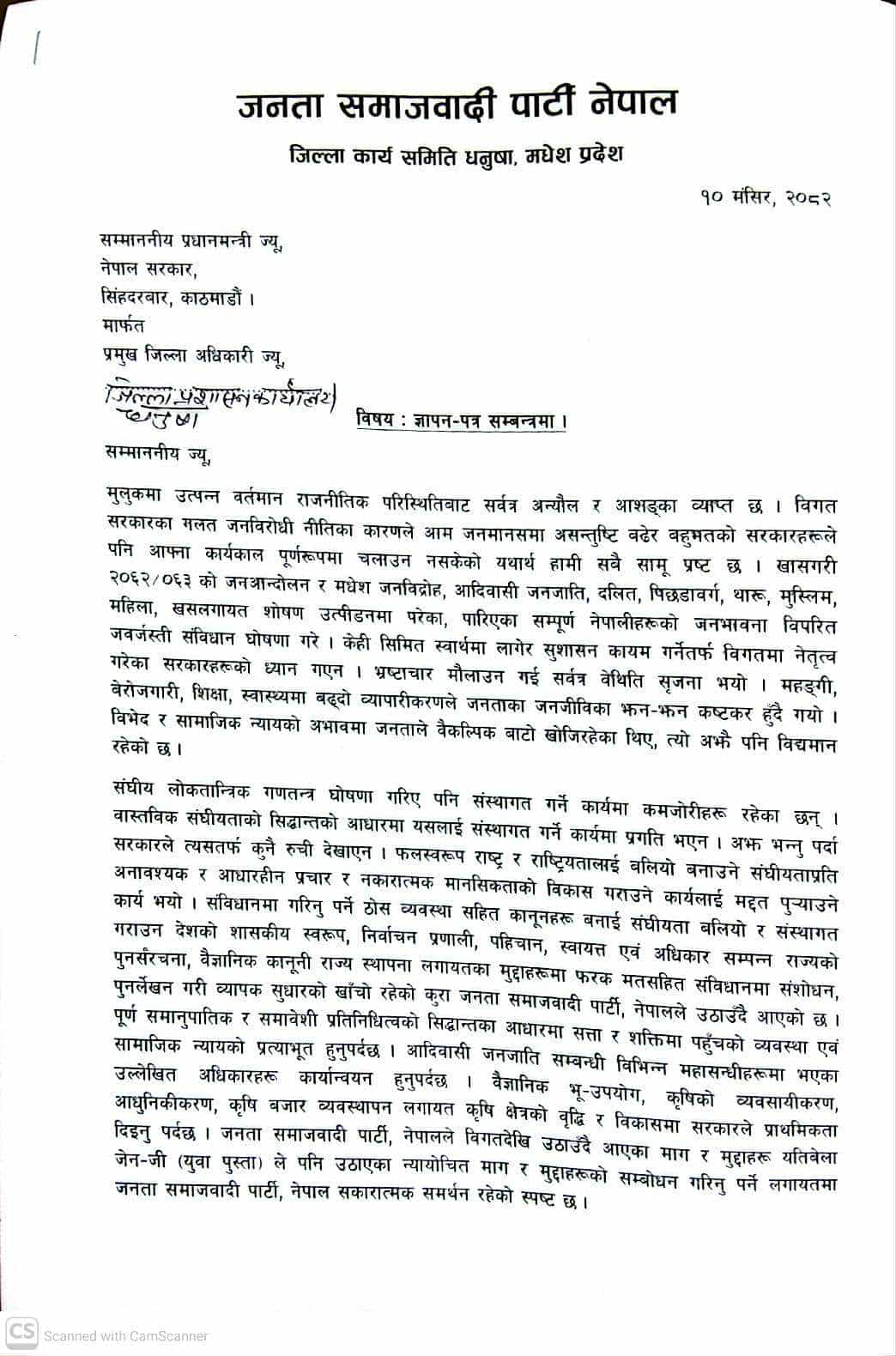 जनकपुरधाम, १० मंसिर । जनता समाजवादी पार्टी नेपाल धनुषाले मुलुकको वर्तमान राजनीतिक, सामाजिक र आर्थिक परिस्थितिका बारेमा चिन्ता व्यक्त गर्दै प्रधानमन्त्रीलाई ज्ञापन पत्र पेश गरेको छ । ज्ञापन पत्रमा जसपाले मुलुकमा उत्पन्न अन्यौलपूर्ण परिस्थितिको समाधानका लागि २३ बुँदे मागहरू राखेको छ ।