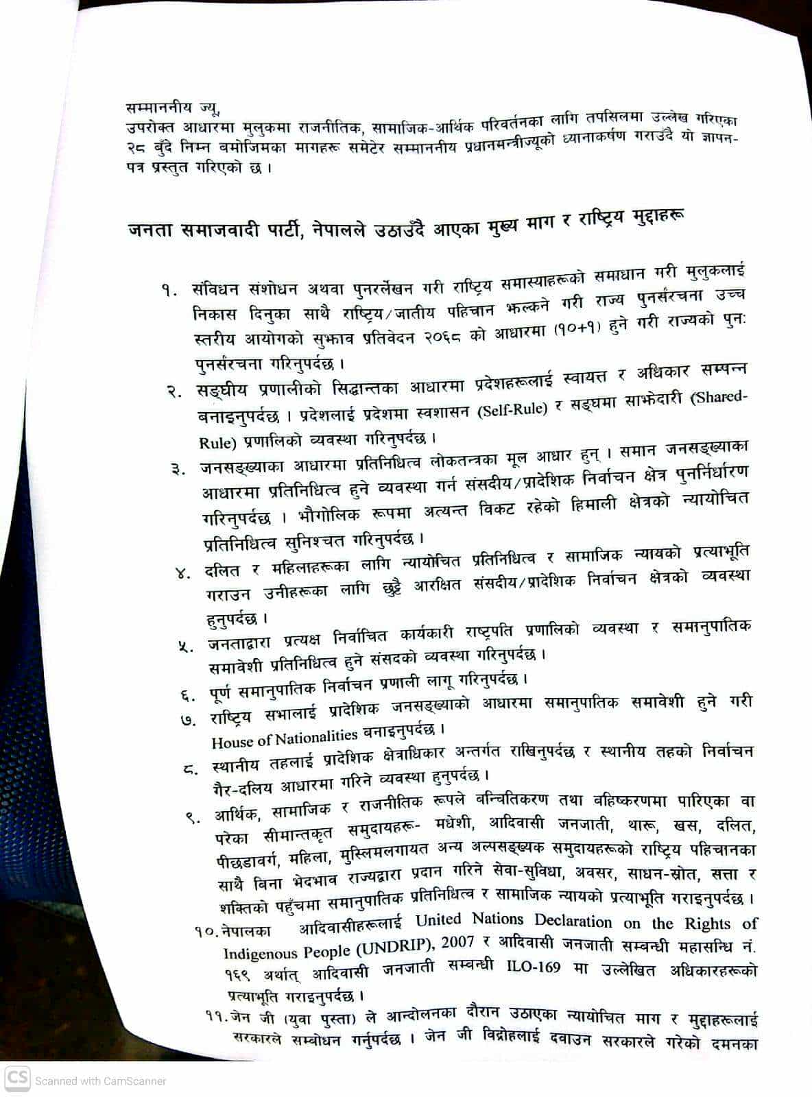 ज्ञापन पत्रमा जसपाले संविधान संशोधन र पुनर्लेखनको माग गर्दै मुलुकको वास्तविक संघीयता लागू गर्न र सामाजिक न्याय सुनिश्चित गर्न आग्रह गरेको छ । जसपाका अनुसार २०६२/०६३ को जनआन्दोलन र मधेश जनविद्रोहलगायत विभिन्न उत्पीडित समुदायका शोषण र उत्पीडनका विरुद्ध जवर्जस्ती संविधान निर्माण गर्नु अनैतिक र अस्वीकार्य थियो ।